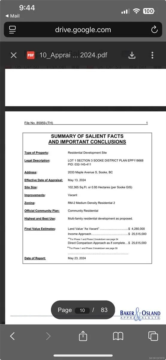 2.35 acres of Prime development opportunity in the heart of Sooke. This centrally located RM2-zoned property is offered for sale with significant density potential & supporting documentation in place. The current OCP supports the development of 47 units. Structures have been removed; the site is ready for development (not excavated). Development Permit Submitted: Mar 2025 for a 47-unit condo development. The design Concept consists of 8 buildings, 6 units per building (1 building includes a flex space for gym or storage). The draft OCP allows up to 65 units, with the site plan designed to accommodate 3 additional buildings. Meetings held with the District of Sooke with verbal support received for current DP submission. This project offers multiple build-out strategies depending on your investment goals, the project could proceed as strata-titled condos for sale or as CMHC rental units with stratified buildings. Call for your full package today!