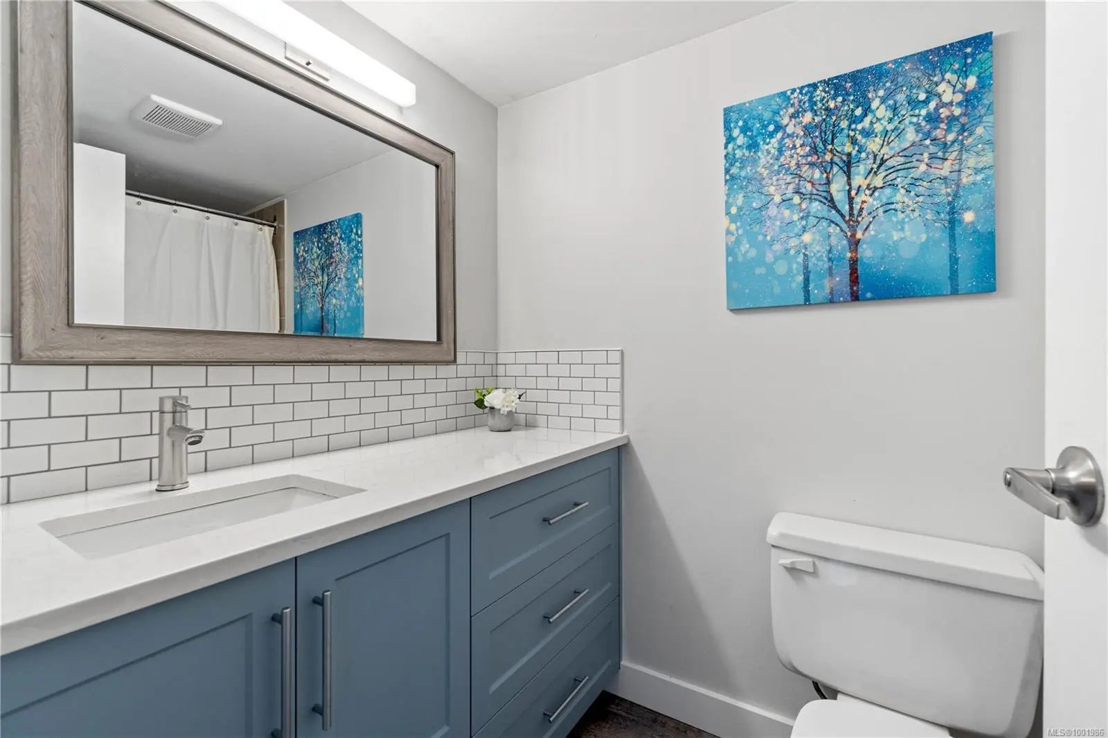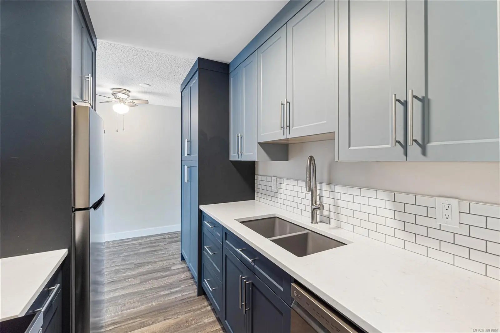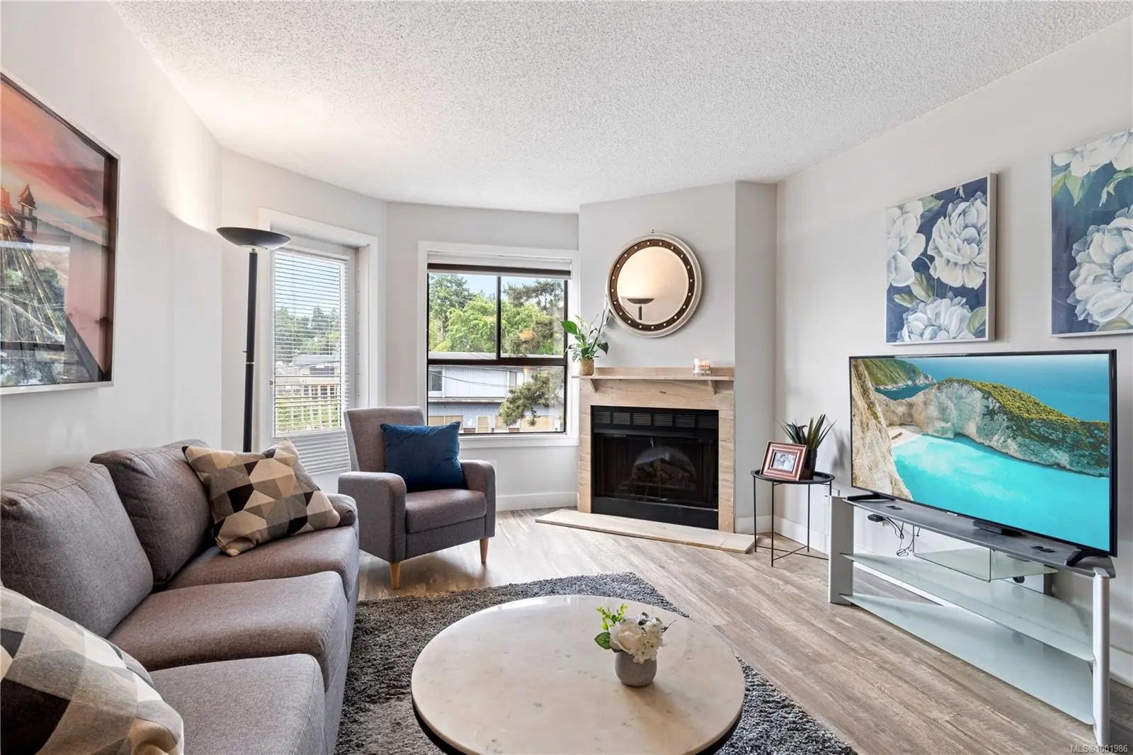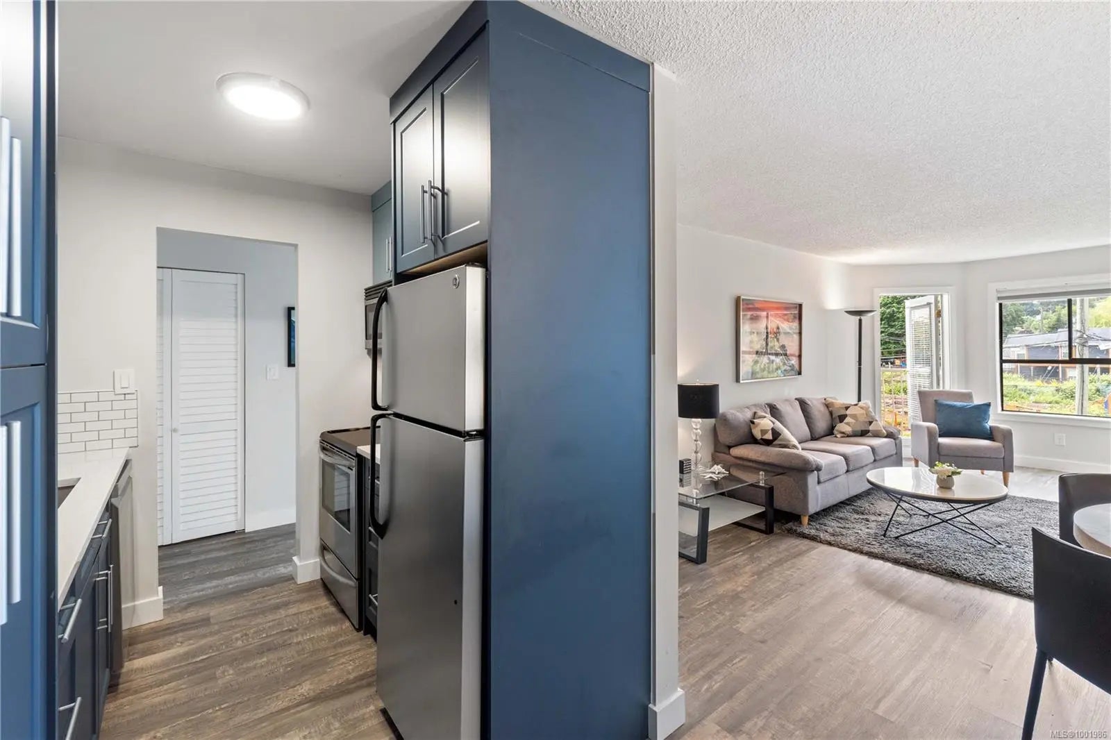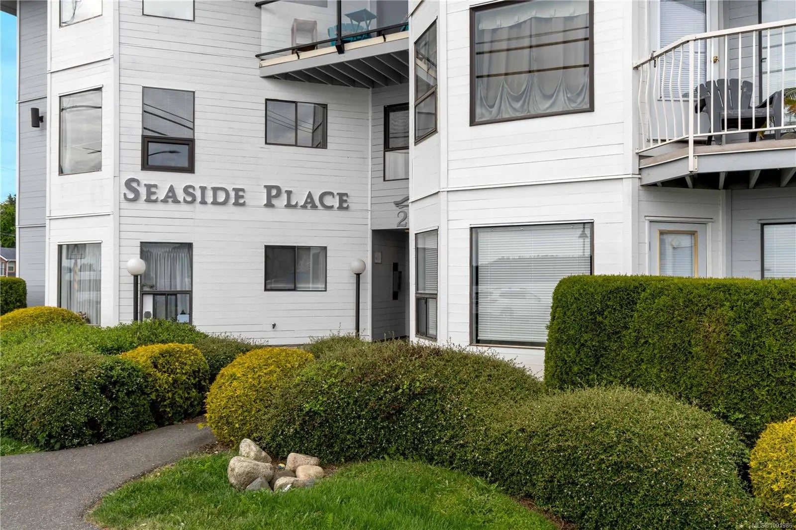 Affordable ocean view living! Located directly across the street from Departure Bay Beach, this thoughtfully renovated 1 bed, 1 bath condo at Seaside Place offers lovely views from your covered balcony. High-quality custom kitchen & bath renovations include soft-close cabinetry with designer finishes, quartz countertops (Cambria Weybourne), pull-out pantry storage, and updated luxury vinyl plank flooring, as well as in-suite laundry. Modern neutral colours, new closet doors & fixtures create a fresh, move-in ready feel. Functional layout with spacious bedroom, galley kitchen, 4-pc bath, and in-suite storage. Walk to parks, shops, transit & more. Well-managed strata with low fees, 1 parking spot included. 1 indoor cat allowed; rentals permitted.