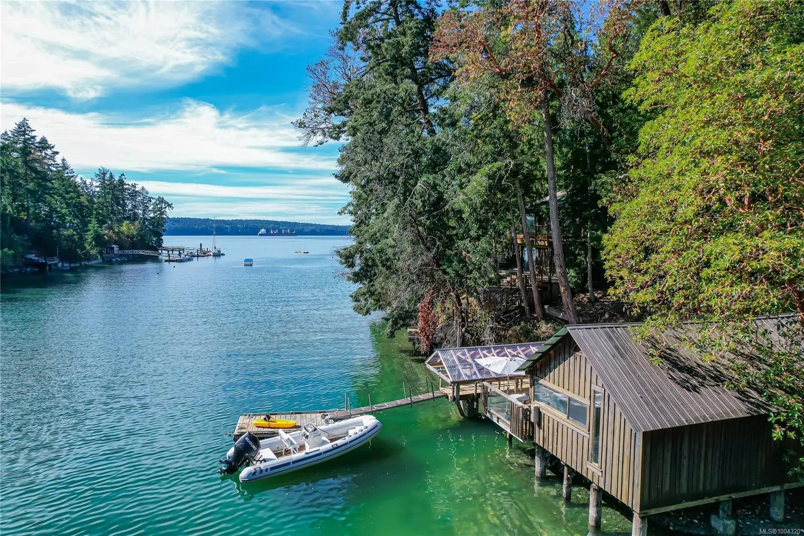 Calling all water enthusiasts! This well-built, upgraded 4 bedroom plus office, 3 bathroom waterfront home on a southwest-facing property with 100+ feet of frontage on the tranquil Southey Bay is in move-in condition. One can live entirely on the main level with 2 bedrooms, an office, 2 bathrooms, an open-plan brand new kitchen, and dining room with a covered deck overlooking the bay. Spread out with guests on the walk-out lower level with a family room, bedroom, bathroom as well as storage. Attached is a 2-car garage wired for EV charging, a small detached workshop, and a garden storage shed. Most unique and exciting is the 1960's boat house perched directly above the emerald green water with an adjacent boat launch sized for boats up to 20 feet. At high tide, Southey Bay appears like a sheltered lagoon, spectacular for swimming, watching island bird and marine life, boating, paddling, and kayaking. Truly one of the most usable waterfront properties on the market.