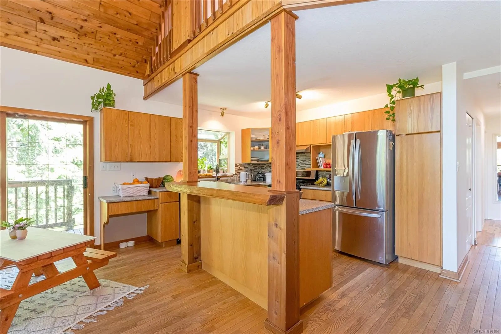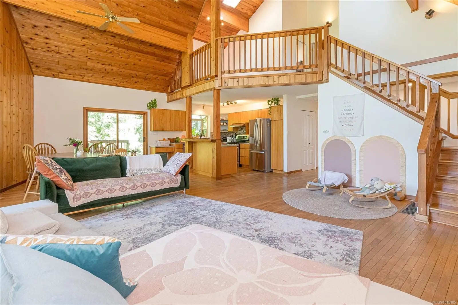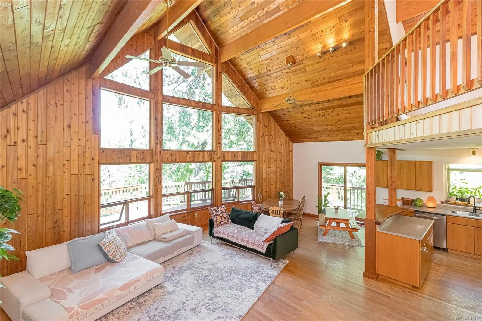 Tucked away on 10.35 private acres, this West Coast-style home blends natural beauty with modern comfort. The open main level showcases soaring 22’ ceilings, a woodstove, expansive windows, and seamless flow between kitchen, dining, and living areas. Two bedrooms and a full bath with laundry complete this floor. Upstairs features a loft-style area and a serene primary suite with double closets and a 5-piece ensuite. The walk-out lower level includes a cozy family room, bathroom, storage, wet bar with second kitchen potential, and access to a covered patio and hot tub. Enjoy over 700 sq/ft of decking, pond, seasonal creek, attached garage, detached garage with two lifts, small cabin best suited for art studio or guests, and Quonset hut for additional storage. Steps from the Trans Canada Trail—ideal for hiking, biking, and riding. A rare find in a peaceful, natural setting!