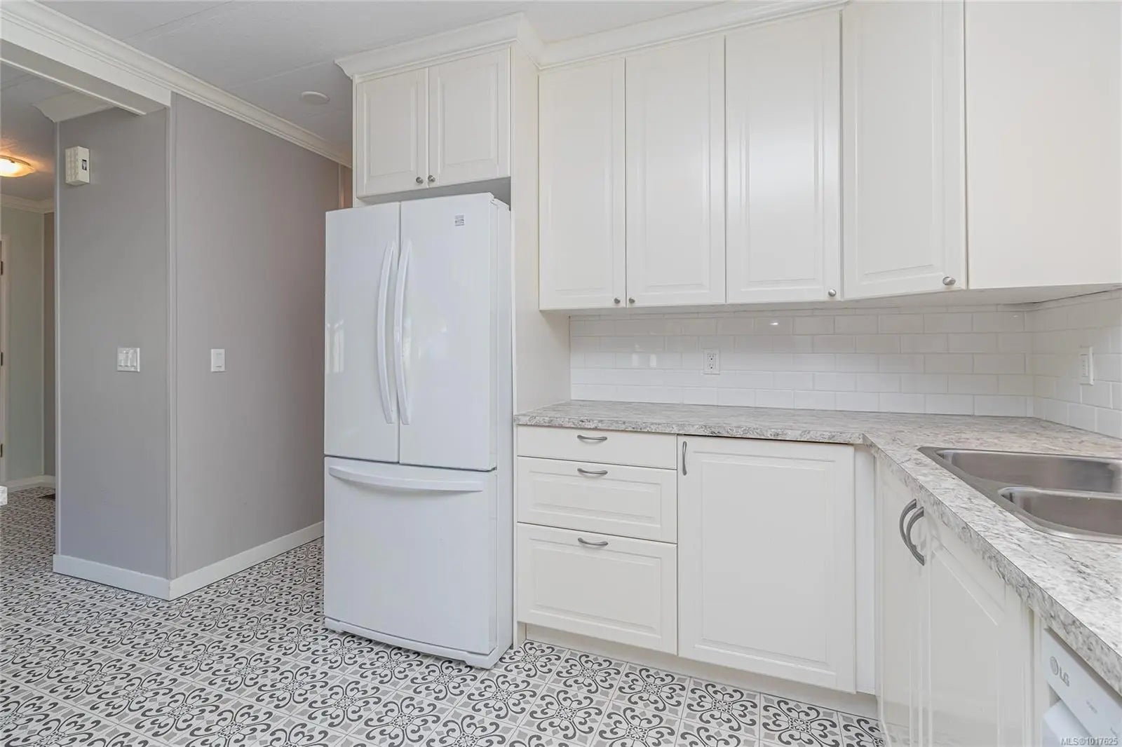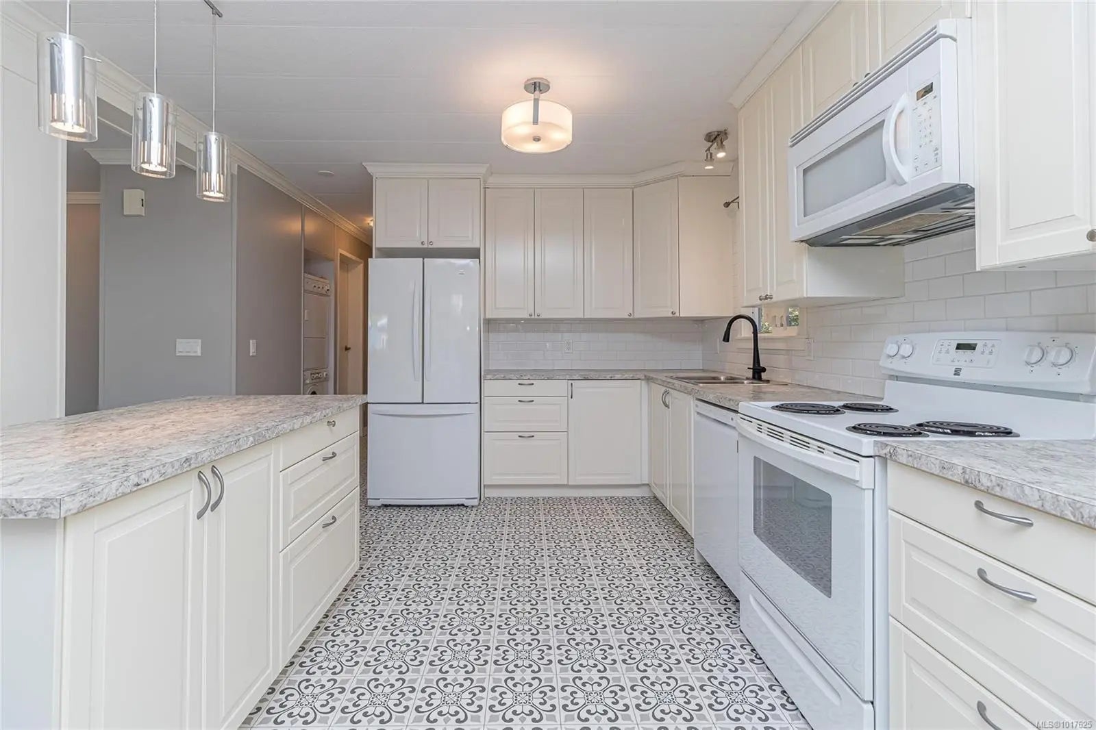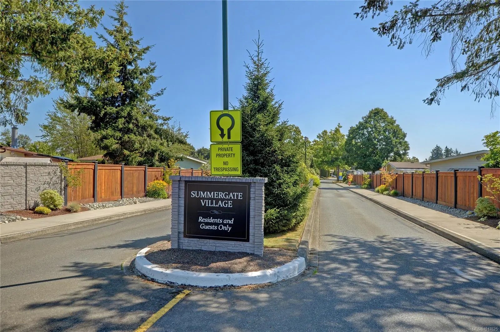 Welcome to Summergate Village, a sought-after 55+ Bareland Strata community of 235 homes. Set on a 3,196 sq ft lot, this beautifully updated 2-bed, 2-bath one-level residence is a wonderful alternative to condo living, offering comfort, privacy, and ease. Enjoy a huge new kitchen featuring endless storage with drawers, cupboards, and a built-in pantry. The open-concept living and dining area is bright and inviting, enhanced by crown mouldings and quality wood blinds. Recent improvements include new flooring, interior paint, and a private deck backing onto the forest—ideal for relaxing or entertaining. A new exterior shed provides added space for tools or hobbies. Year-round comfort comes from an efficient heat pump, while updated plumbing, wiring, and vinyl windows offer peace of mind. Low strata fee of $327/month. Enjoy vibrant amenities including a heated indoor pool and hot tub, community hall with daily activities, library, games room, and meeting space.