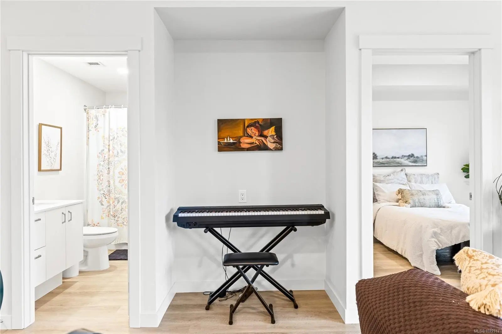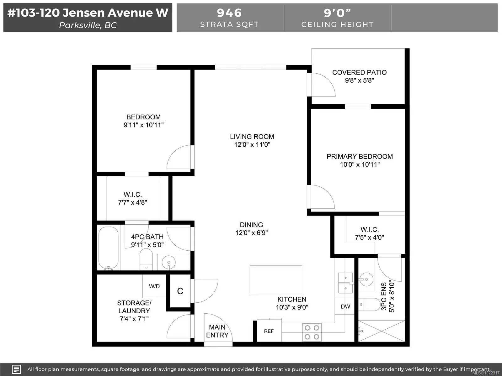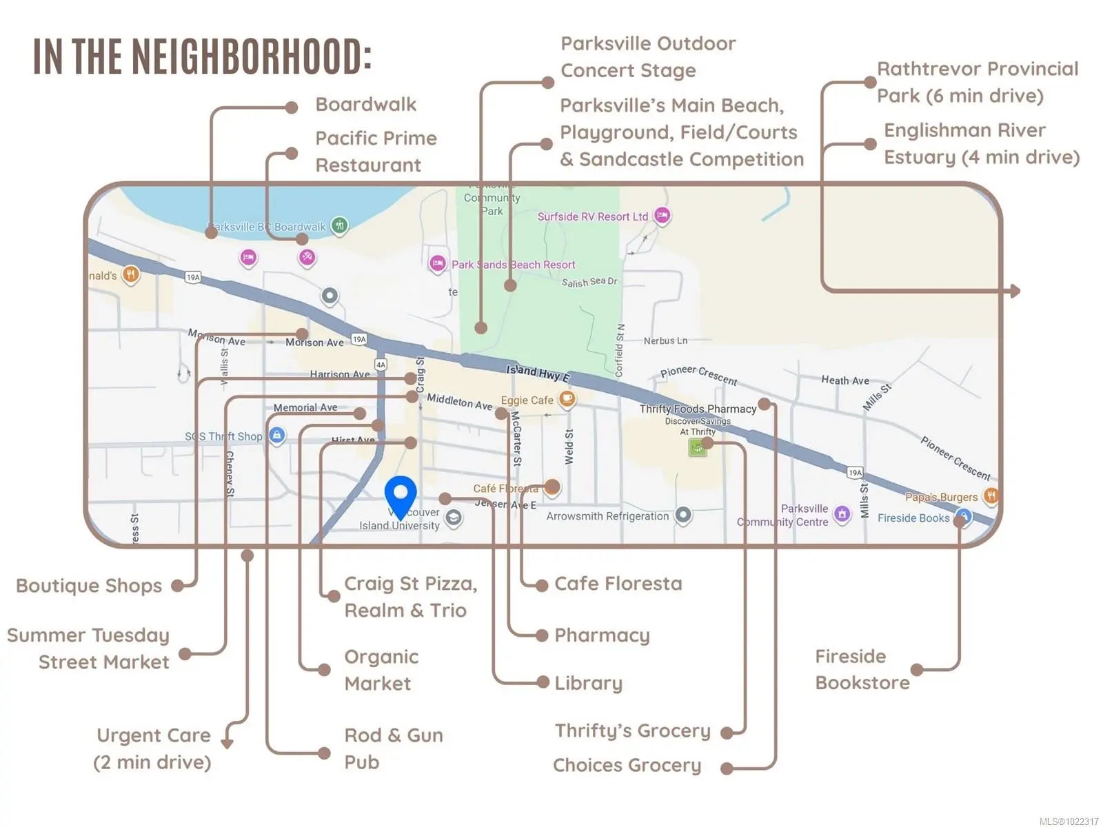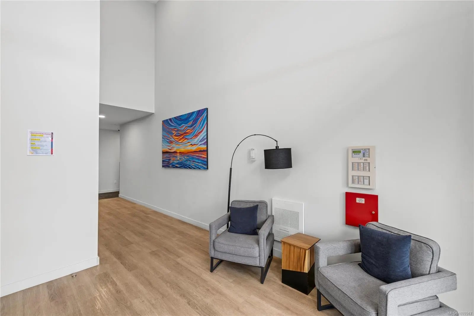 Welcome to Mosaic, a modern 2 bed/2 bath home built in 2023. This light filled first floor unit offers easy access while sitting above street level for added privacy, with open sightlines to the coastal mountains and a peekaboo ocean view. Oversized windows enhance the airy feel, while the stylish kitchen features quartz countertops, soft close cabinetry and a large island. The open floor plan is ideal for entertaining and extends to a covered balcony perfect for morning coffee or summer evenings. Both bedrooms feature walk-in closets, complemented by an in-suite laundry/storage room plus a separate storage locker. Included is a sought after underground parking stall with opt. EV charging upgrade. Designed with efficiency, the home offers a heat pump for heating/cooling, hot water on demand, triple pane windows and smart water shut off. Steps to Parksville’s main beach, groceries, coffee shops, restaurants and trails, this is central living at its best. Pet/rental friendly.