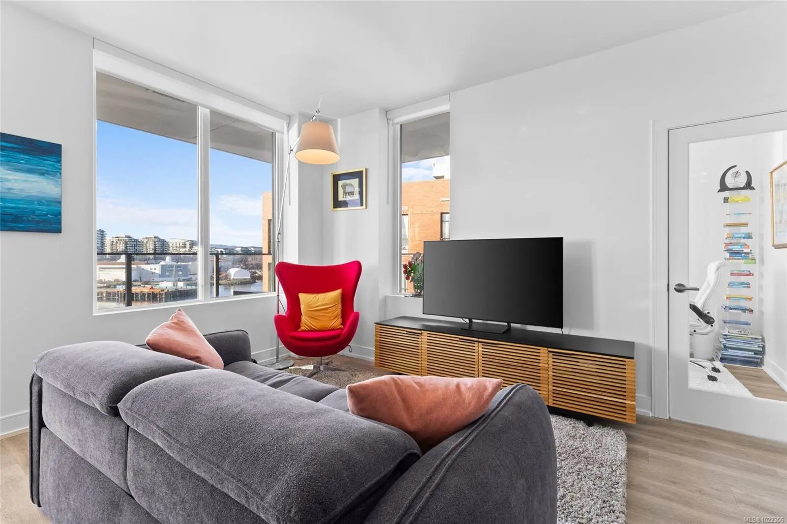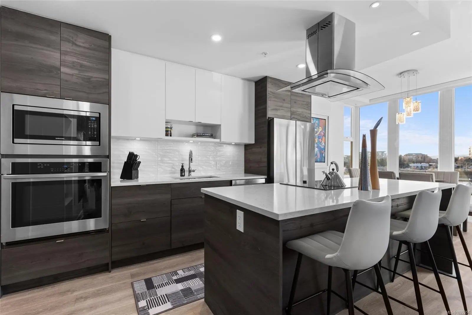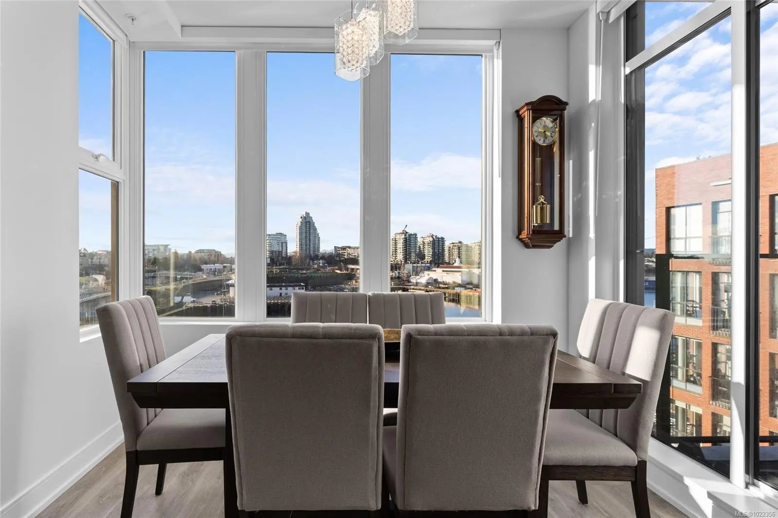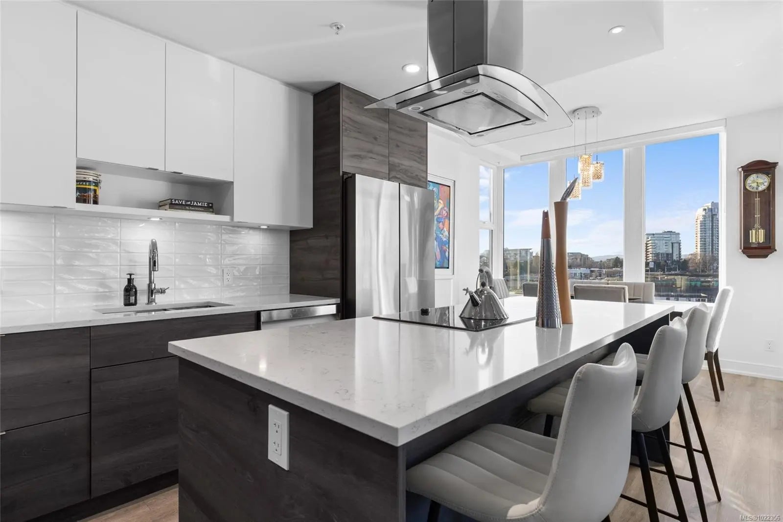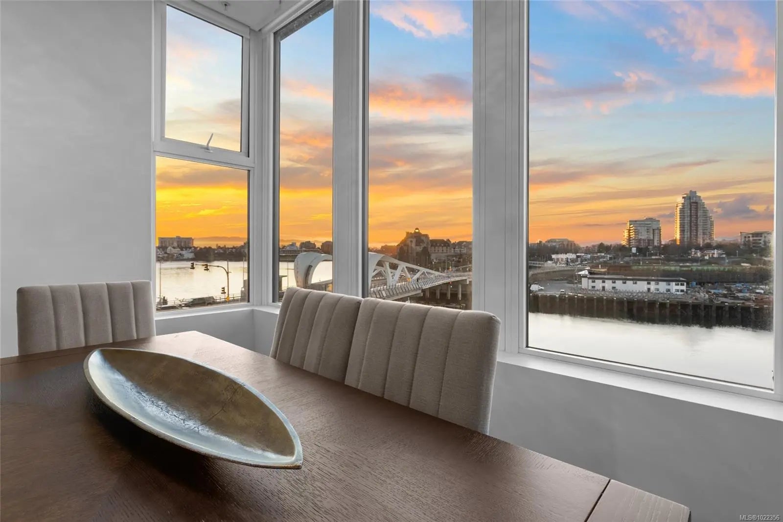 Welcome to your new home at The Pearl. Set along the waterfront in Victoria’s vibrant Old Town with the Blue Bridge as its neighbour, this stunning 2-bedroom + den residence blends modern design with everyday livability. Thoughtfully designed, the open-concept layout features 9’ ceilings, expansive windows, and a light-filled interior finished with quartz countertops, soft-close cabinetry, premium appliances, and custom built-ins that elevate both style and function. Two beautifully finished bathrooms add a spa-like touch, while the flexible den is perfect for a home office or guest space. Enjoy serene outlooks by day and glowing city views by night, featuring the iconic Johnson Street Bridge, inner harbour, and Olympic Mountains. Residents enjoy access to a social lounge, gym, and an inviting lobby—this showcases waterfront living that is sophisticated, stylish, and refined.