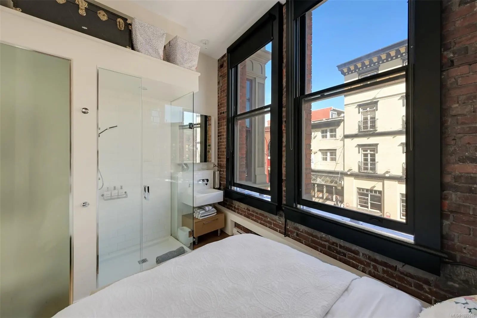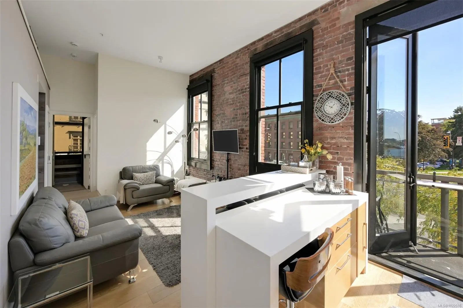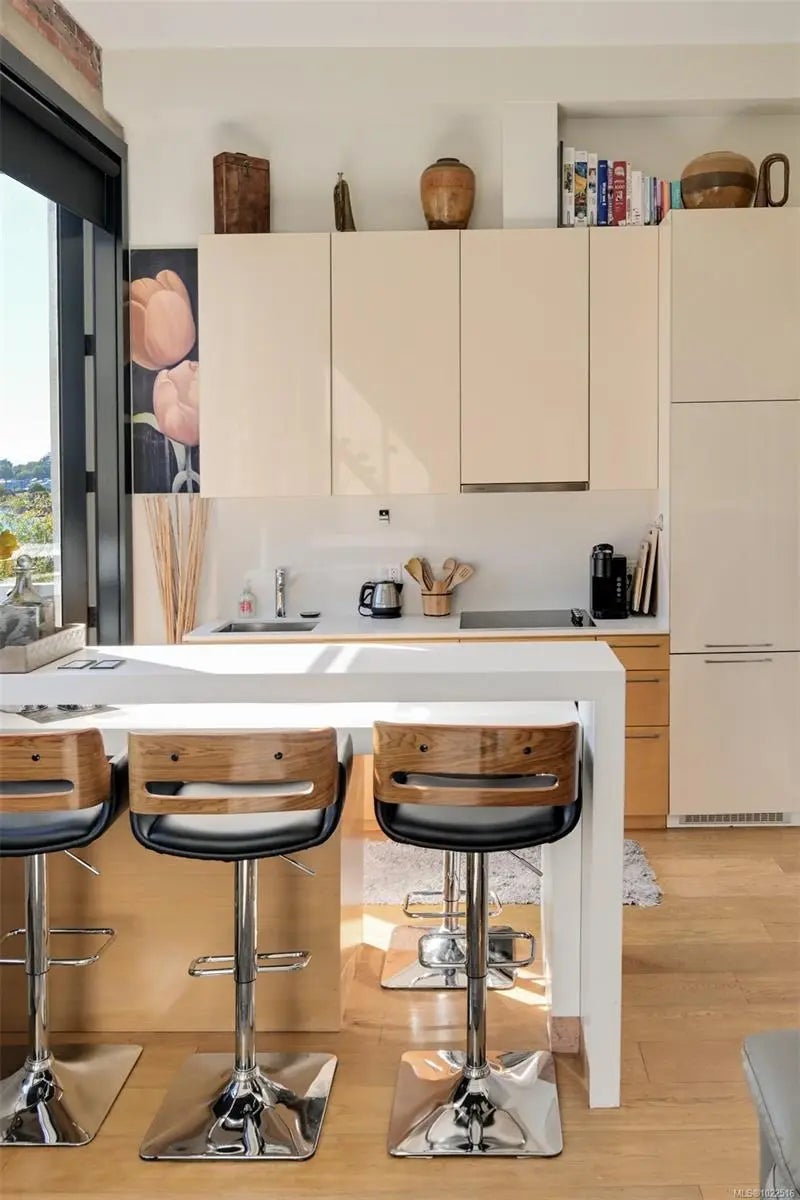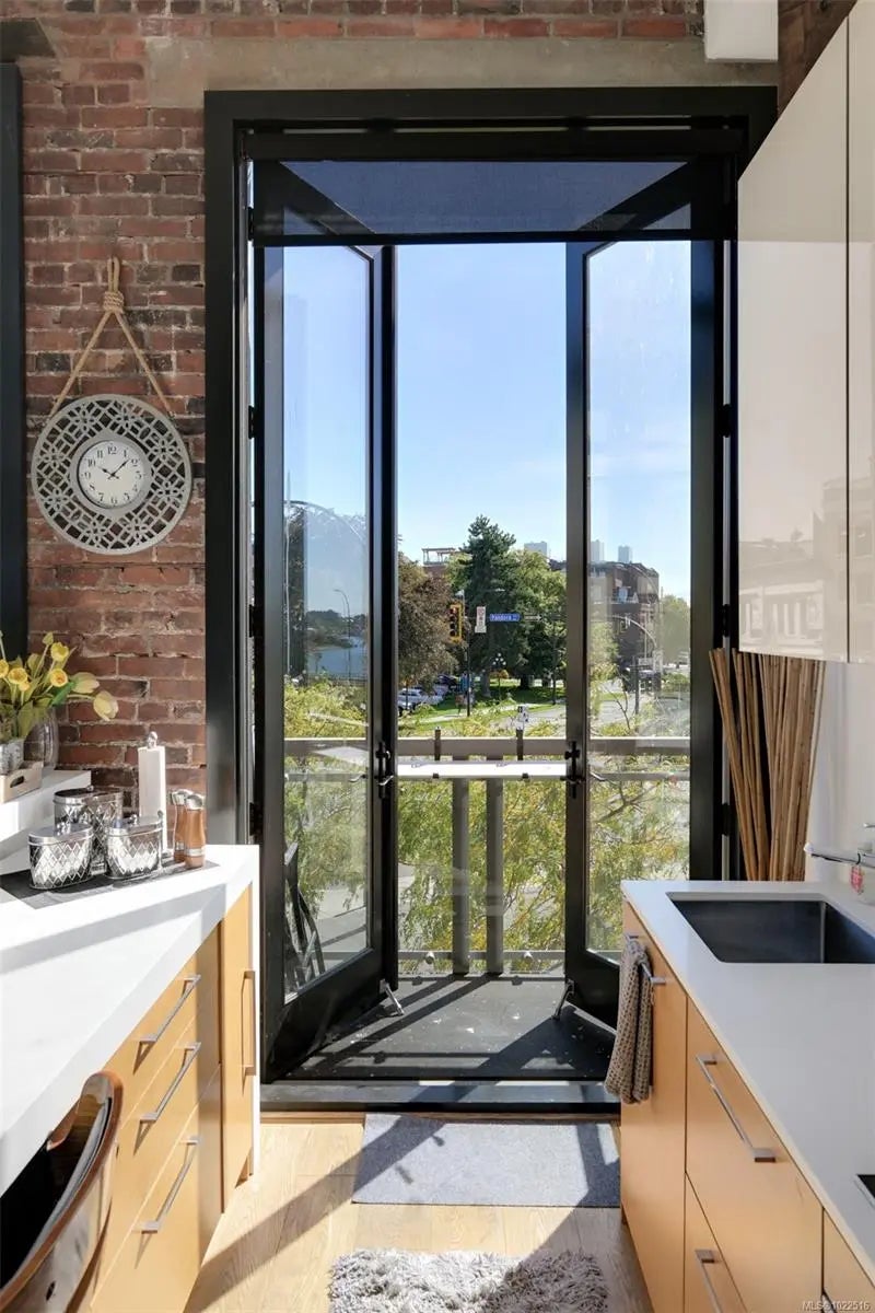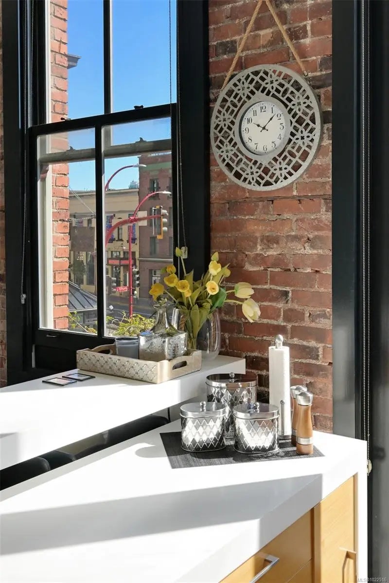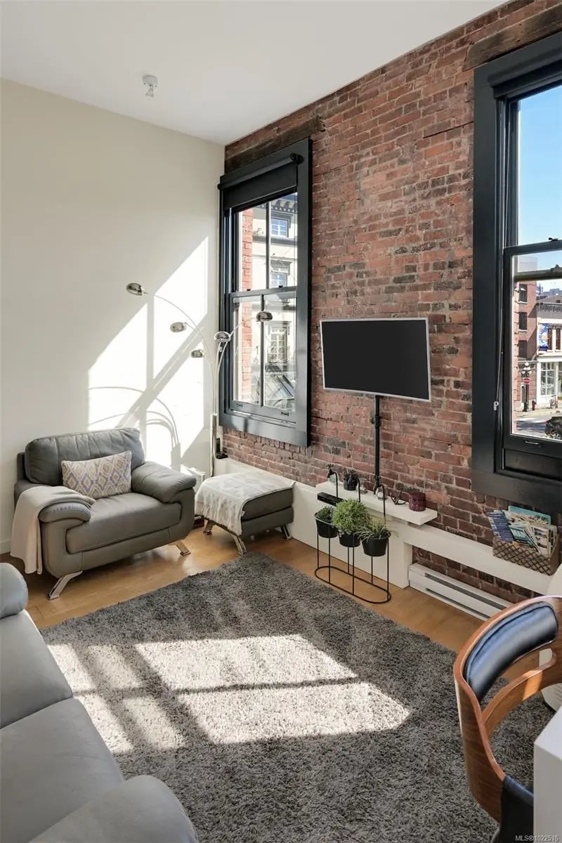 Experience urban living in the iconic Janion building, where heritage charm meets modern style. This bright SOUTH-FACING 2-bedroom features original exposed brick, oversized windows, and views of the bustling City, and Inner Harbour. Designed with efficiency in mind, it offers a built-in wall bed, integrated storage, engineered oak flooring, quartz countertops, a hidden-drawer dishwasher, refrigerator, freezer, and in-suite washer & dryer. Enjoy in-floor heating in the bathroom for added comfort. The Janion boasts premier amenities: rooftop terrace with BBQ and kitchen, fitness centre, conference room, bike/kayak storage, and internal beach access. Located in the heart of Downtown Victoria, steps to shops, dining, and the waterfront. Ideal for students, digital nomads, or snowbirds as it's fully furnished; this New York style condo is your gateway to the best of the city. Location, lifestyle, and iconic views—this is modern living at its finest.