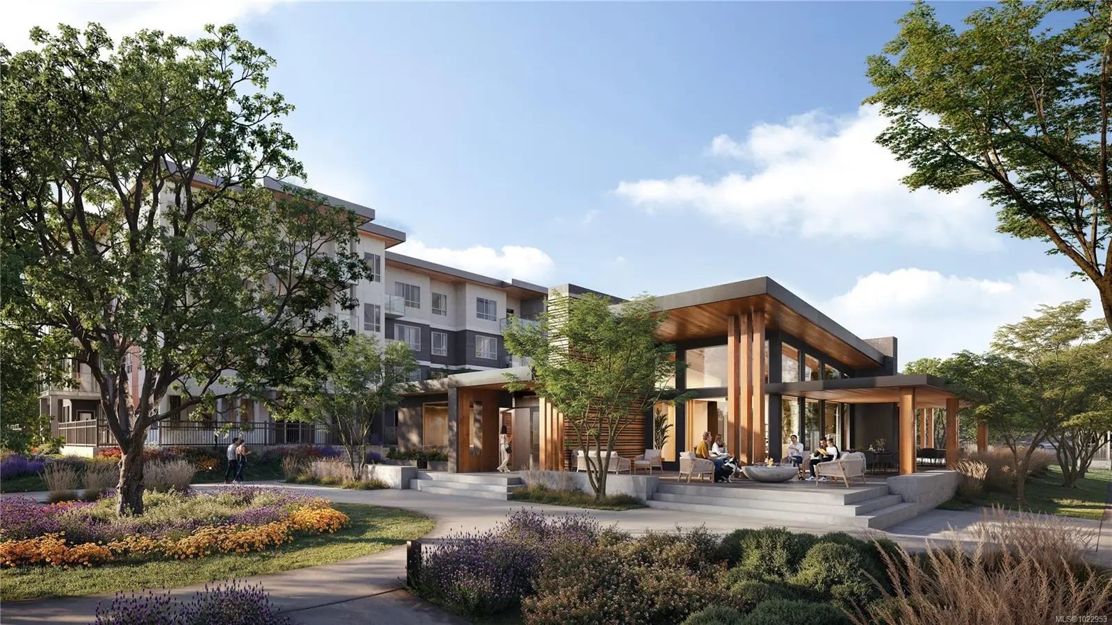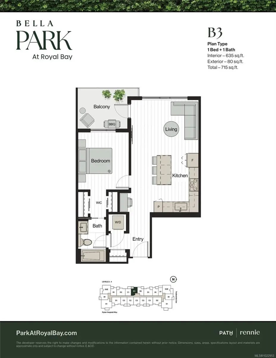 Discover Royal Bay living in this stylish 1-bedroom condo by award-winning PATH Developments. Located in a walkable seaside community, this 635 sq ft home offers contemporary space with 9-foot ceilings and large windows. Enjoy a west-facing balcony overlooking the courtyard and 2 acres of landscaped greenspace. The modern kitchen features a Samsung appliance package: 30" induction cooktop, integrated range hood, 30" wall oven with air fry, and Silestone quartz countertops with a large-format backsplash. The bathroom offers a floating vanity. Bella Park enhances your lifestyle with a 3,730 sq. ft. Central Park Clubhouse, featuring a fitness centre, social lounge, and wellness amenities: an outdoor hot tub, cold plunge, and wood barrel sauna plus secure bike and kayak storage. The community also provides resident-only community gardens, a bocce court, and a pet wash station. Includes storage locker, secure underground EV-ready parking and AC/heat pump for year-round comfort. Price + GST.
