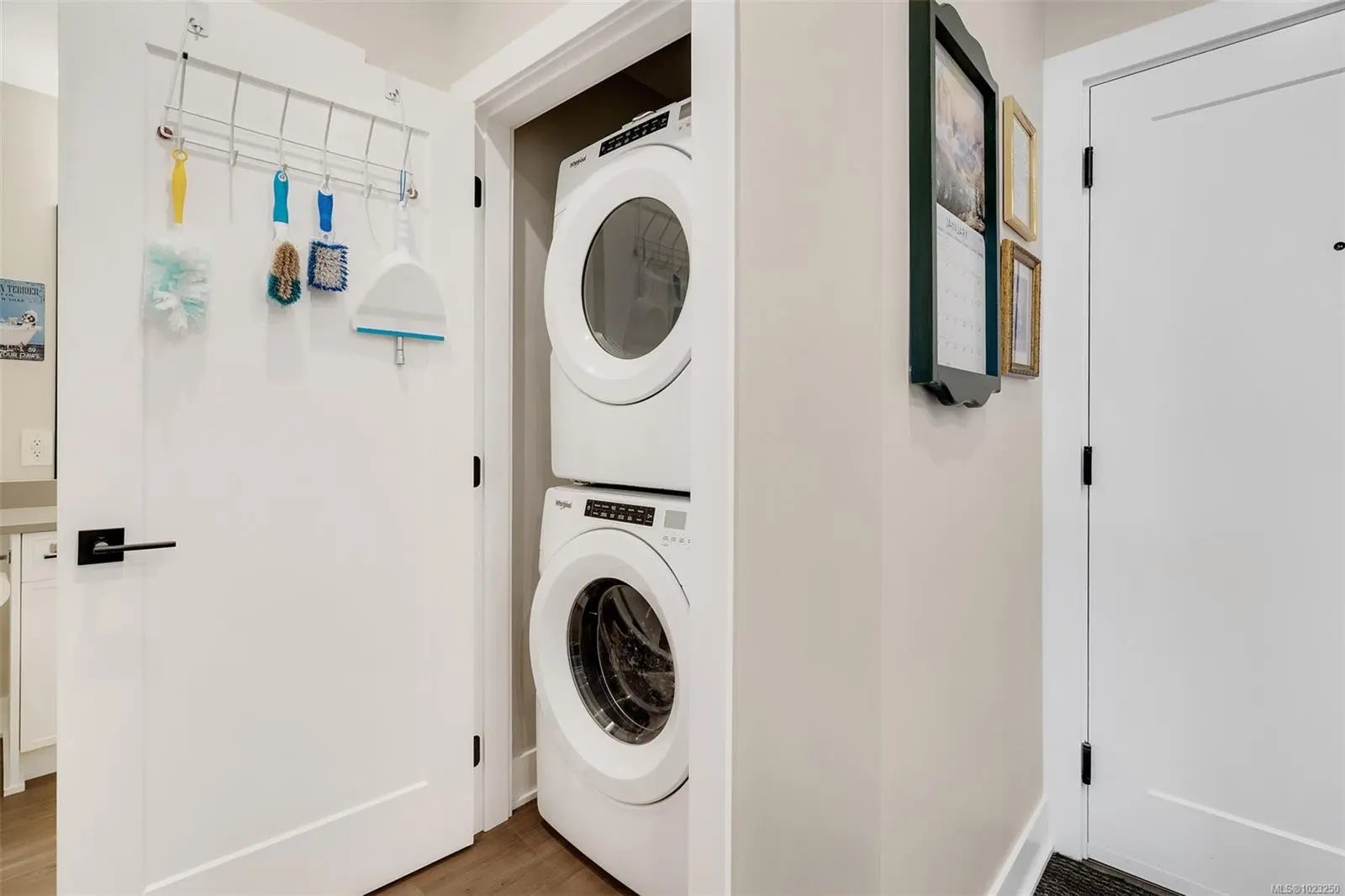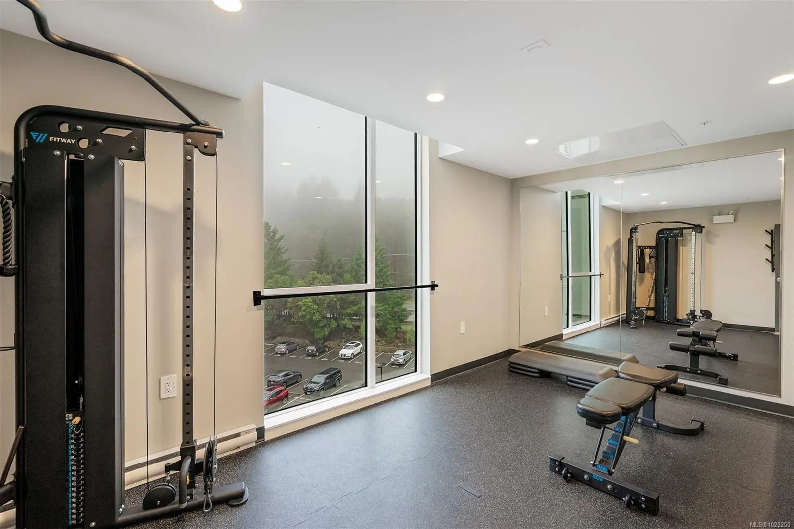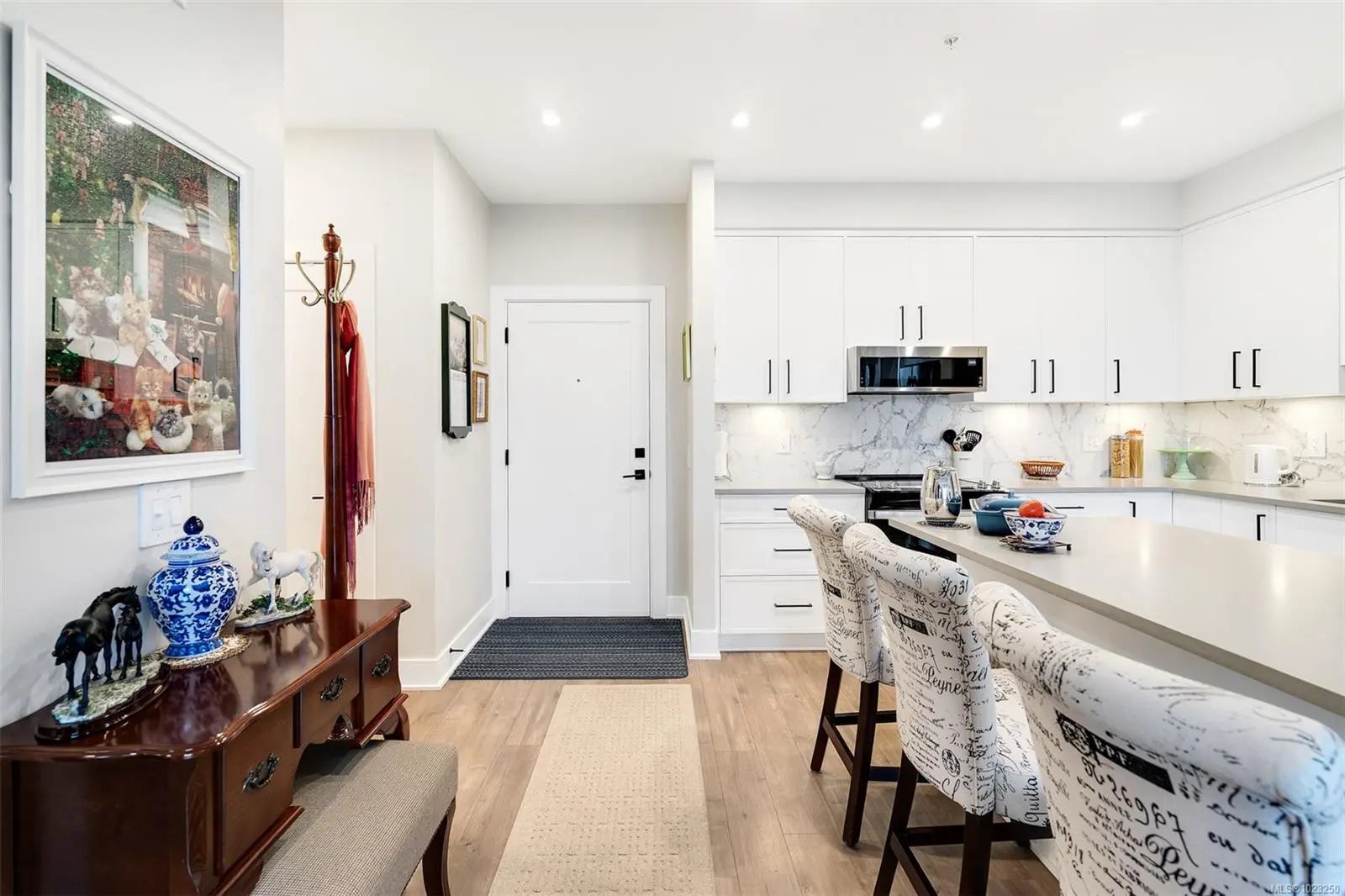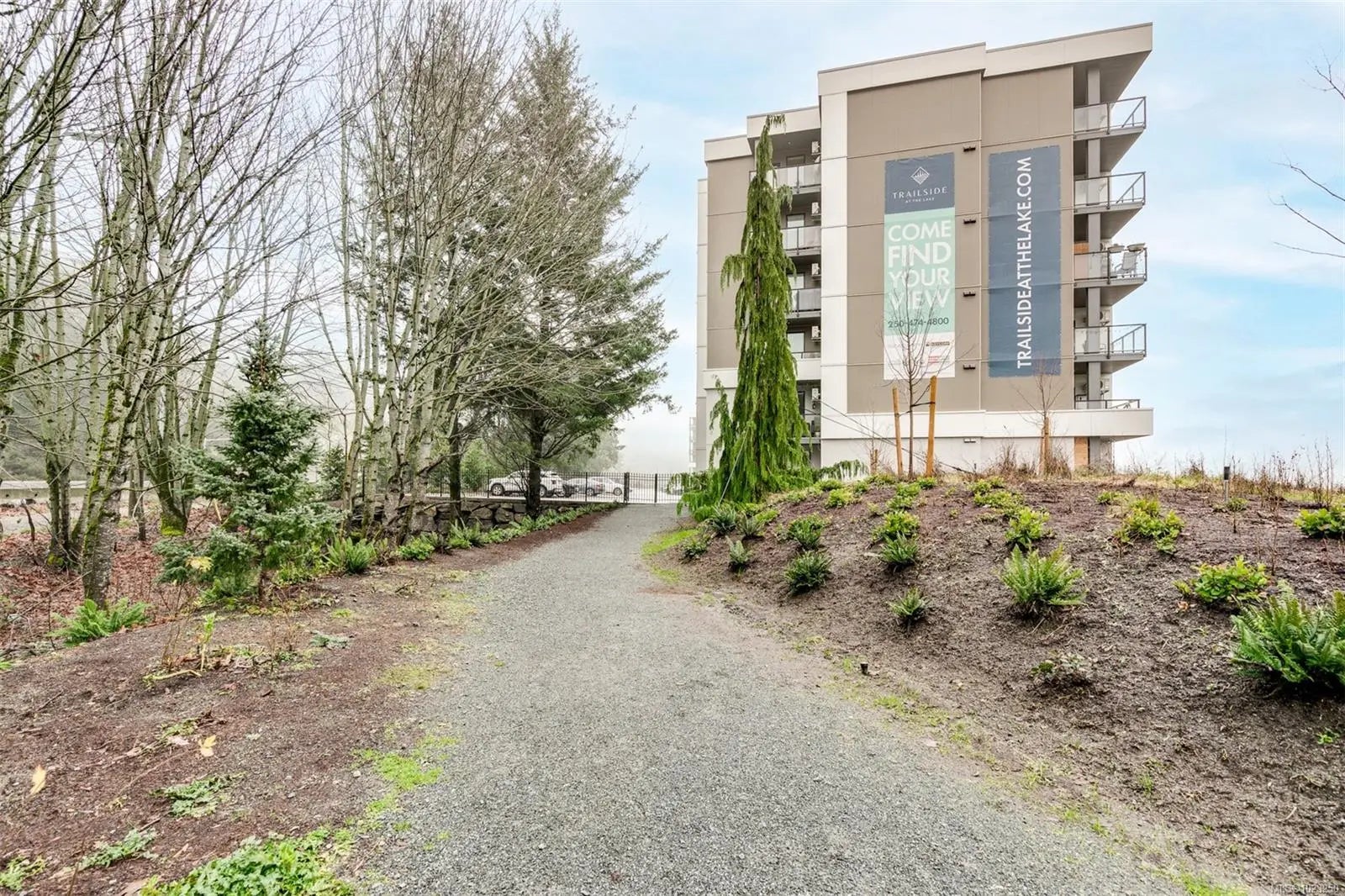 NEW PRICE! Enjoy lush green views toward Langford Lake overlooking the Ed Nixon trail from this nearly new suite at ‘Trailside at the Lake’. This quality 2023 built two bedroom/two bath suite offers an attractive open plan layout with 9ft ceilings, large southwest facing windows and balcony, great separation of bedrooms and bright modern finishes throughout. Those who love to cook will really appreciate the spacious kitchen with ample storage and quartz countertop workspace including the large island eating bar. Heating and cooling are handled by an efficient heat pump system and hot water is heated by a central boiler. The building includes a separate storage locker and bike storage just down the hallway on your own floor, meeting and fitness rooms as well as one off-street parking space and visitor parking. Two pets are allowed so bring your four legged family members. Whether you are a young family or single person starting out or downsizing, this is a wonderful place to call home!