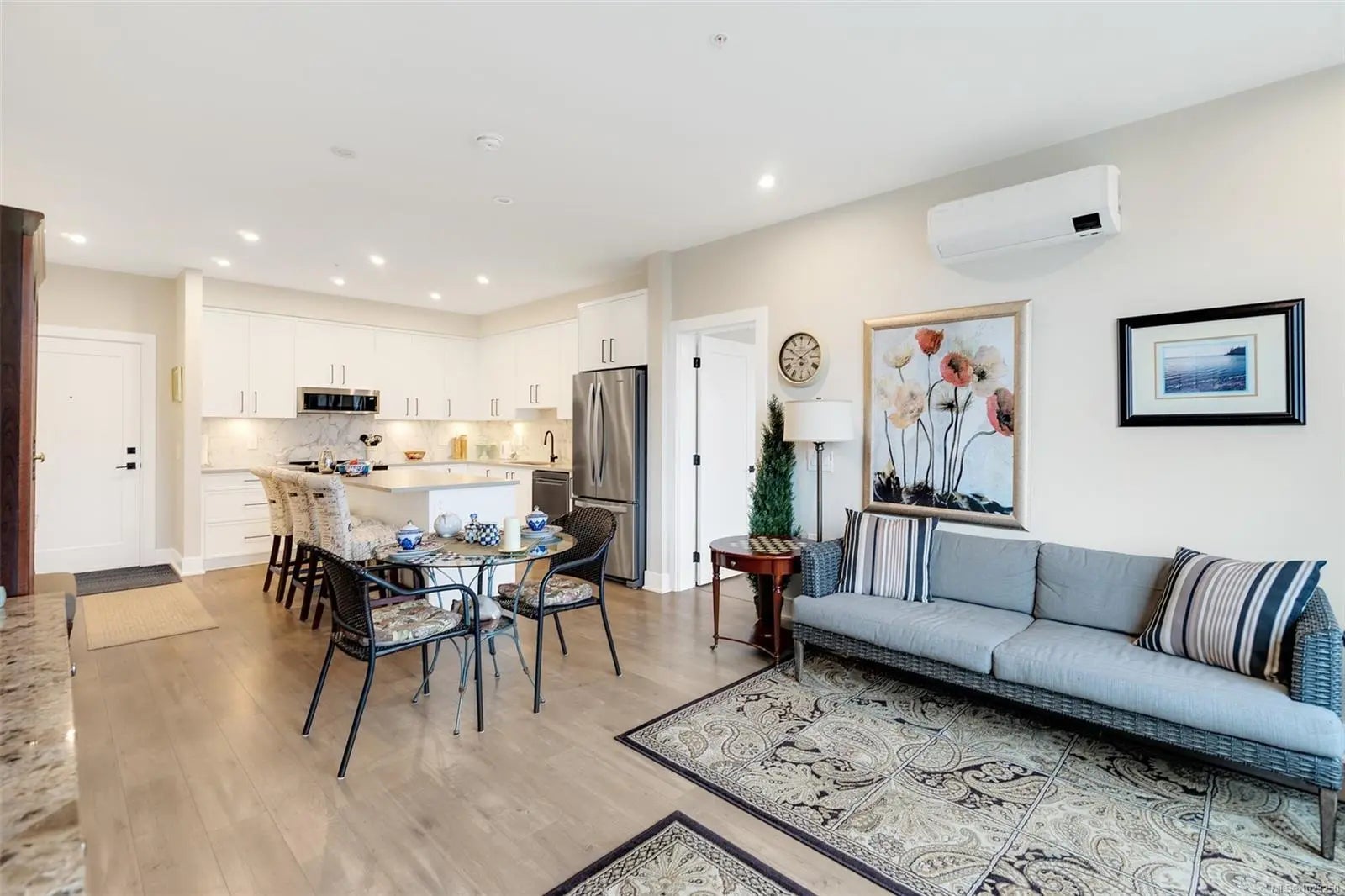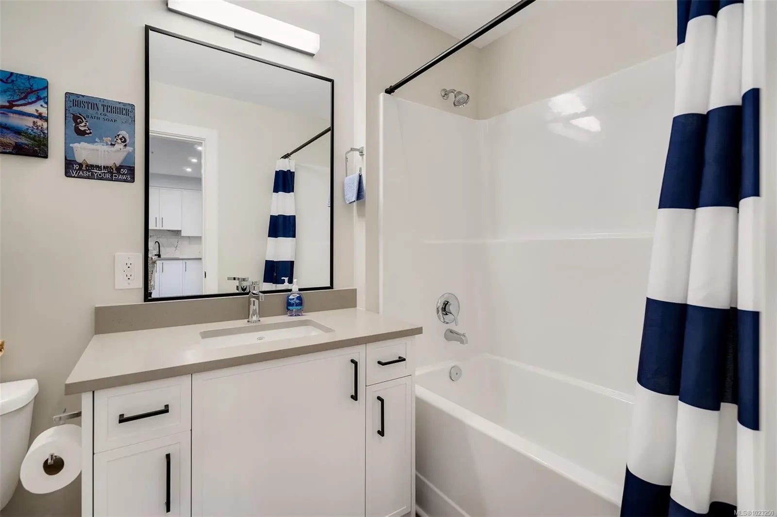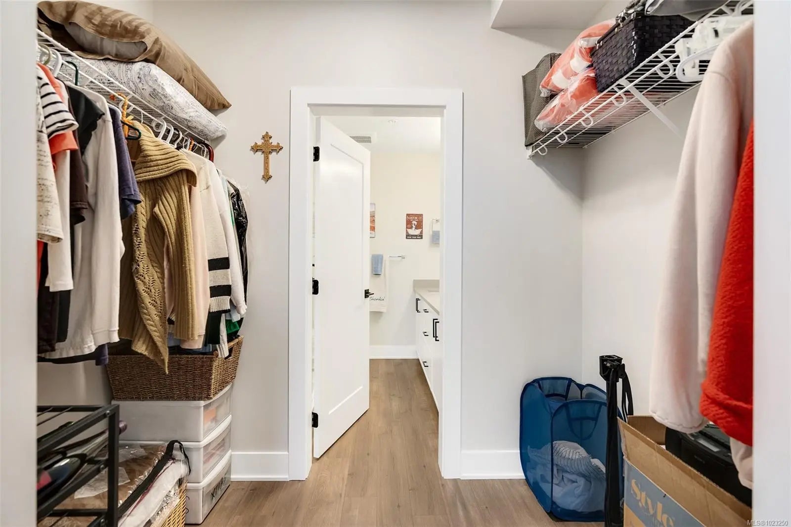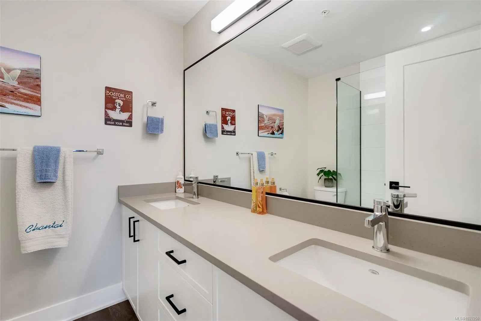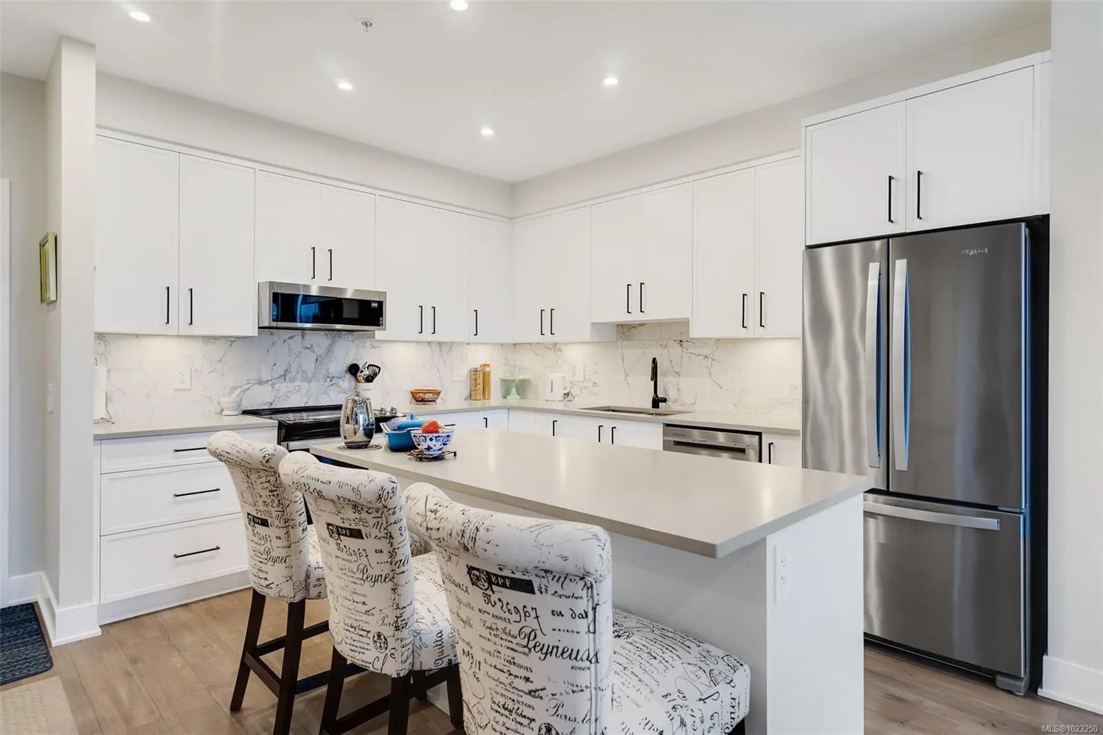 NEW PRICE! Enjoy lush green views toward Langford Lake overlooking the Ed Nixon trail from this nearly new suite at ‘Trailside at the Lake’. This quality 2023 built two bedroom/two bath suite offers an attractive open plan layout with 9ft ceilings, large southwest facing windows and balcony, great separation of bedrooms and bright modern finishes throughout. Those who love to cook will really appreciate the spacious kitchen with ample storage and quartz countertop workspace including the large island eating bar. Heating and cooling are handled by an efficient heat pump system and hot water is heated by a central boiler. The building includes a separate storage locker and bike storage just down the hallway on your own floor, meeting and fitness rooms as well as one off-street parking space and visitor parking. Two pets are allowed so bring your four legged family members. Whether you are a young family or single person starting out or downsizing, this is a wonderful place to call home!