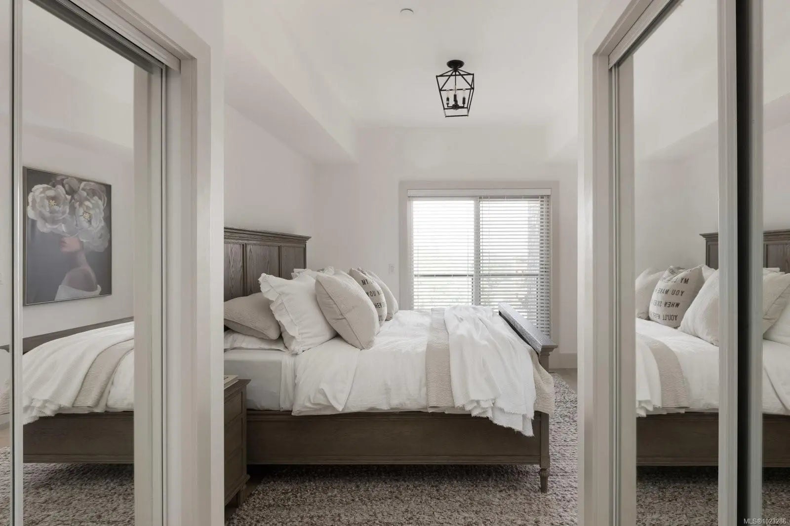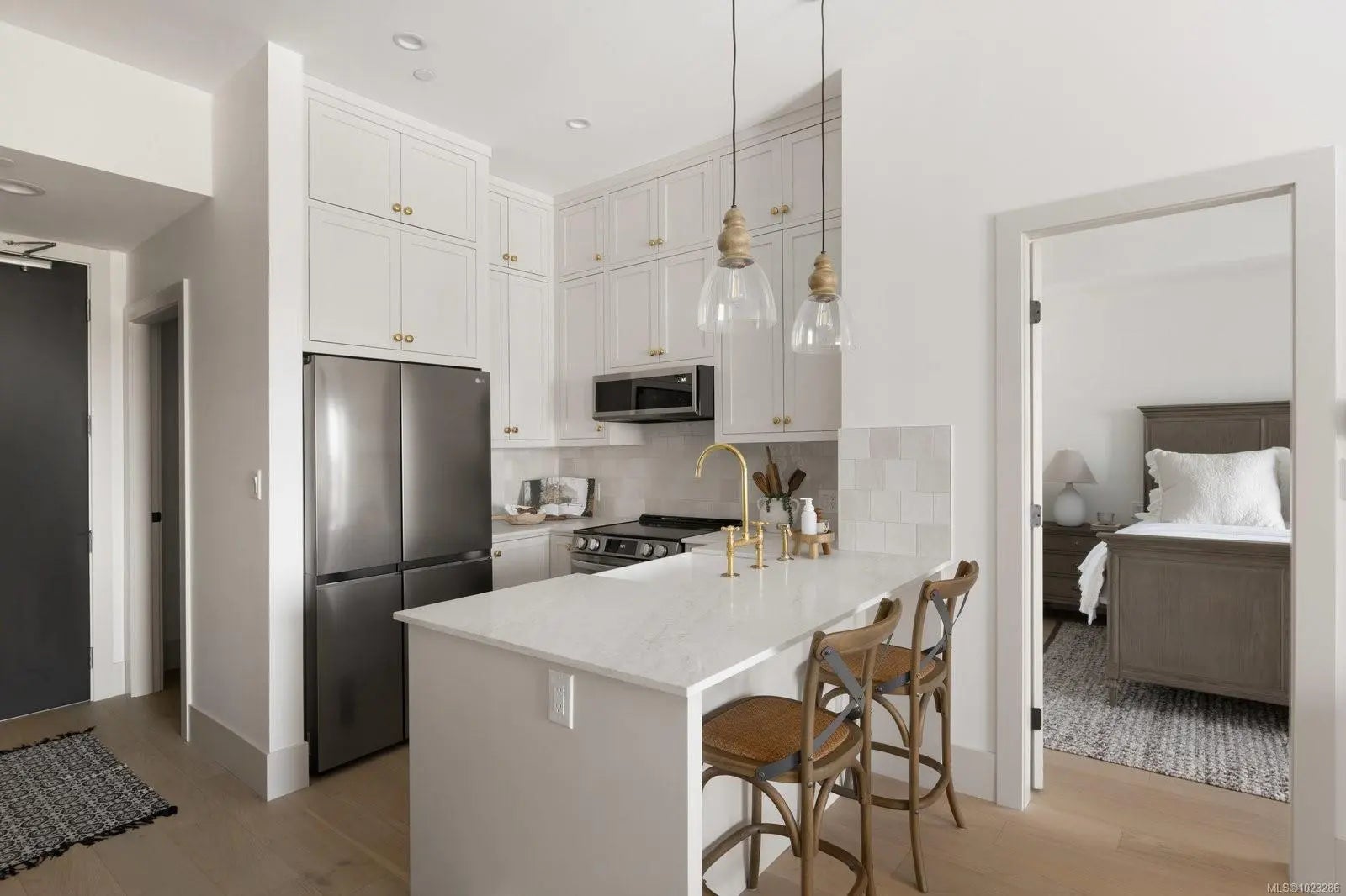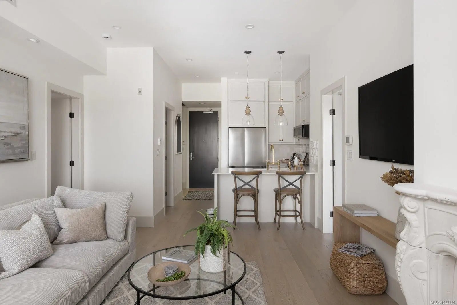 OPEN HOUSE SUNDAY January 25th 1-3pm!Beautifully updated top-floor residence in Ponds Landing, ideally located in the village at Bear Mountain Resort.This 2-bedroom plus den home blends modern elegance with timeless design, featuring curated finishes, designer lighting, and a soft neutral palette throughout.The airy 10-ft ceilings and open-concept layout frame a chef-inspired kitchen with a quartz waterfall island, custom wood cabinetry, farmhouse sink, and striking brass details.The inviting living room centers around a custom stone gas fireplace and opens to a covered patio with peaceful courtyard views.The primary suite offers patio access, walk-through closets, and a spa-like ensuite, while the second bedroom has a walk-in closet. The den presents a built-in desk for a flexible study or work from home space.Enjoy year-round climate control with an efficient heat pump. Complete with in-suite laundry, secure underground parking, and storage locker.