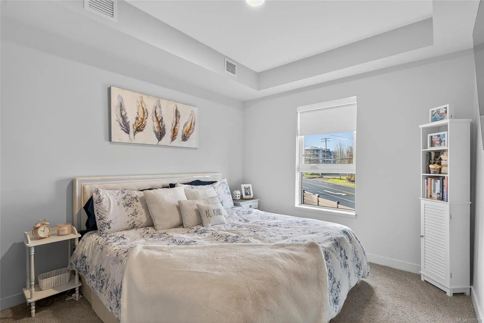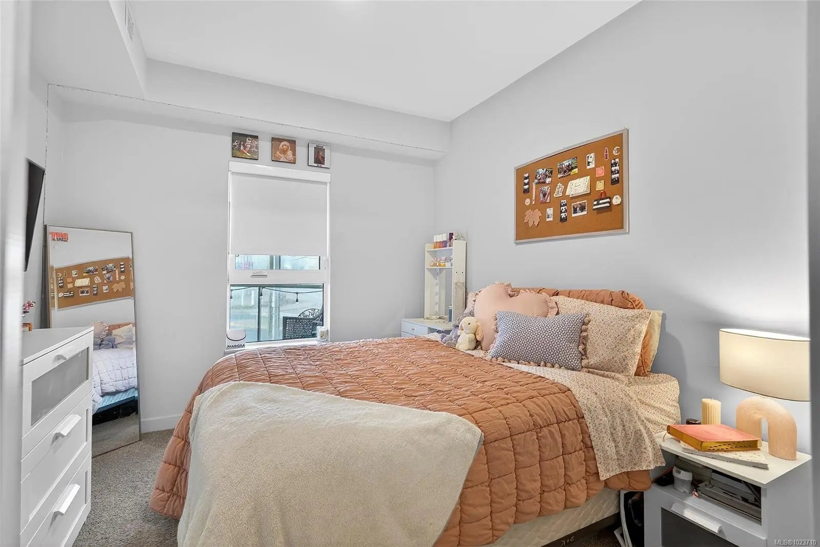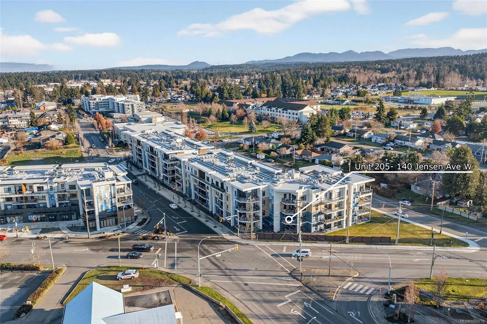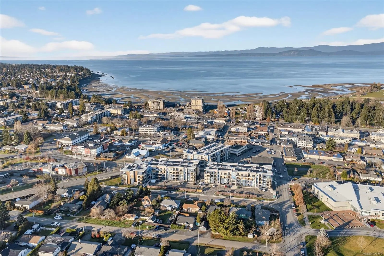 Welcome to Mosaic at Jensen, Parksville’s modern green built condo community in the heart of downtown. This spacious 2 bedroom, 2 bathroom home features the desirable Cabernet floor plan with an open layout and excellent bedroom separation. Northwest facing, the unit offers ocean views toward the Salish Sea and Lasqueti Island, plus a generous balcony ideal for afternoon light and evening sunsets. Inside are 9’ ceilings, quartz countertops, contemporary cabinetry, triple pane windows, and an energy efficient heat pump for heating and cooling. The functional design includes an office nook, in suite laundry, and bright open living space. The home includes a secure underground parking stall steps from the elevator, bike storage, entry with security system, a fourth floor storage locker, plus pet and rental friendly bylaws. Owner occupied and maintained in show home condition. Enjoy a walkable lifestyle with shops, cafes, restaurants, parks, and the beach just steps away.