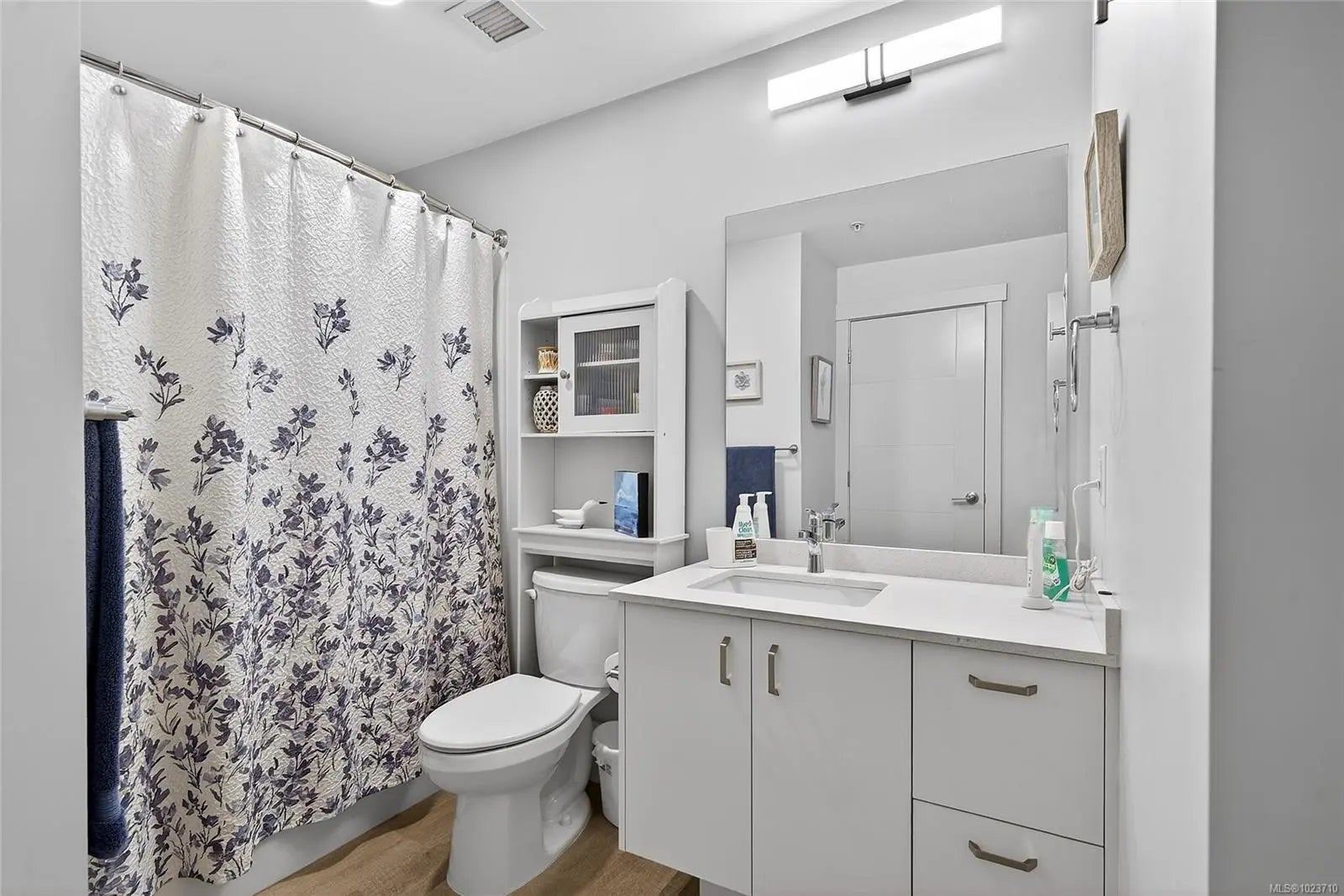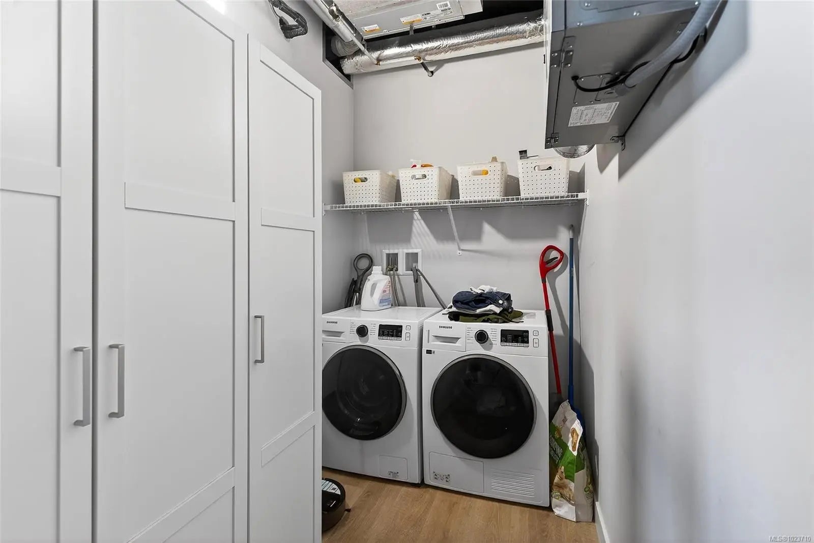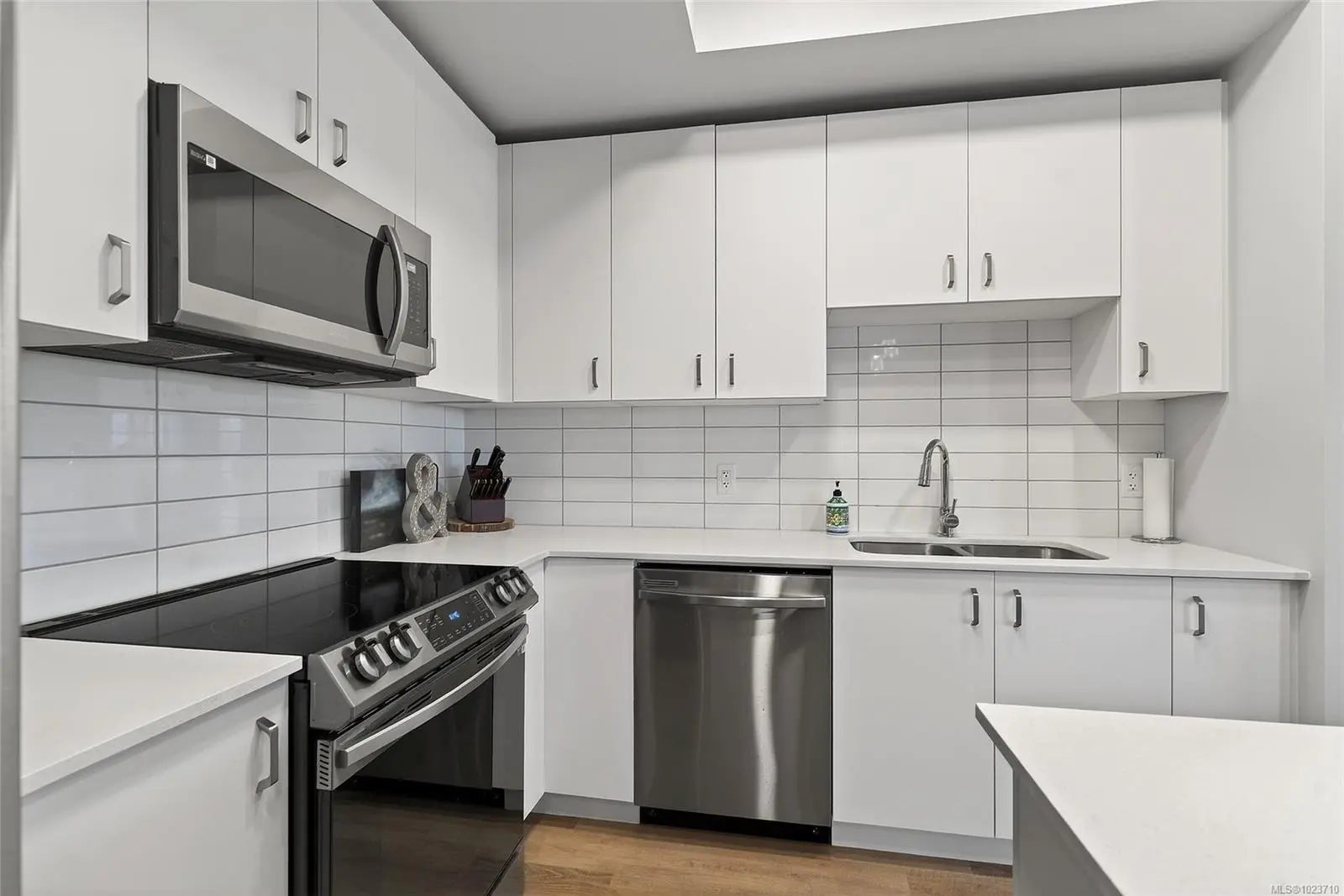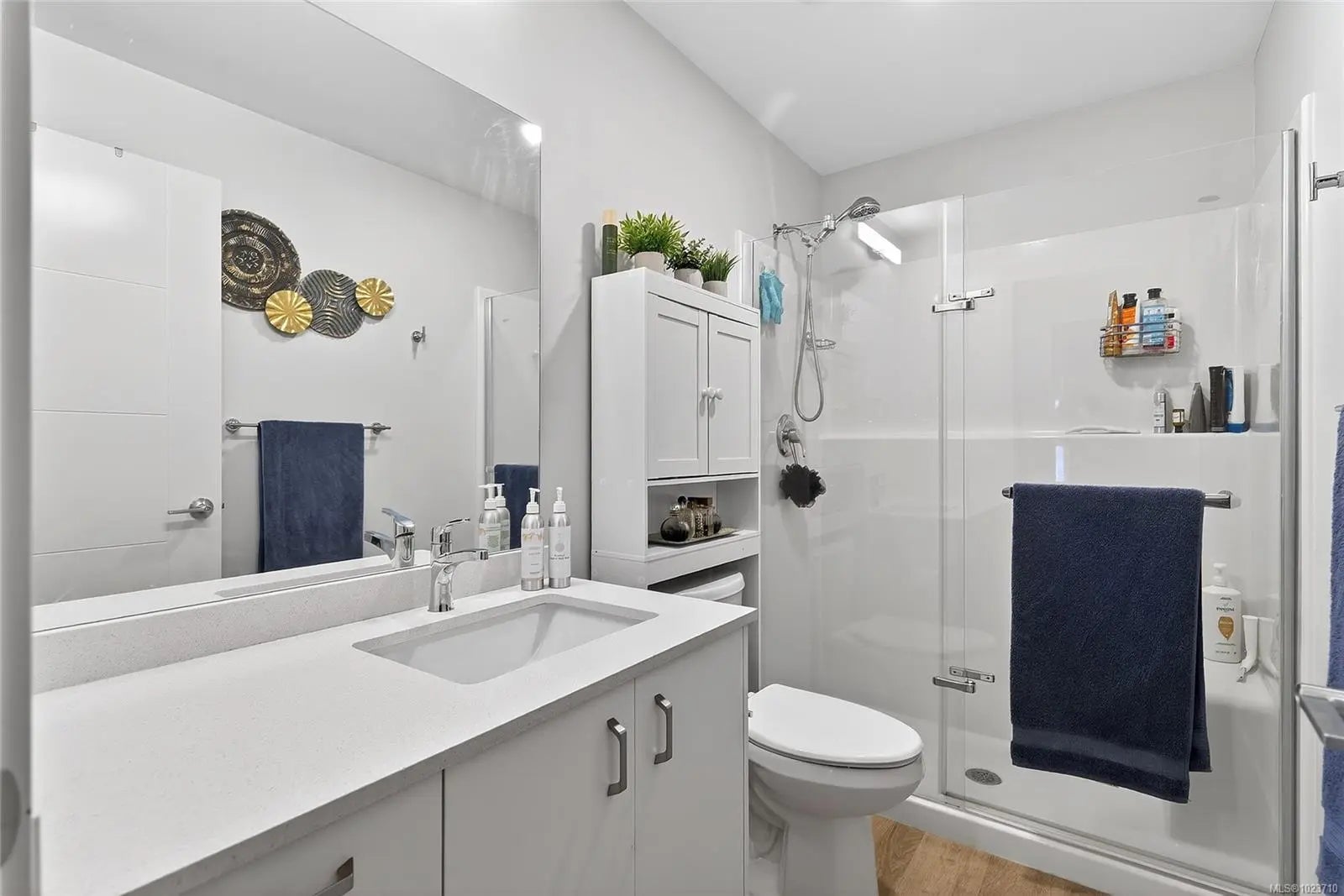 Welcome to Mosaic at Jensen, Parksville’s modern green built condo community in the heart of downtown. This spacious 2 bedroom, 2 bathroom home features the desirable Cabernet floor plan with an open layout and excellent bedroom separation. Northwest facing, the unit offers ocean views toward the Salish Sea and Lasqueti Island, plus a generous balcony ideal for afternoon light and evening sunsets. Inside are 9’ ceilings, quartz countertops, contemporary cabinetry, triple pane windows, and an energy efficient heat pump for heating and cooling. The functional design includes an office nook, in suite laundry, and bright open living space. The home includes a secure underground parking stall steps from the elevator, bike storage, entry with security system, a fourth floor storage locker, plus pet and rental friendly bylaws. Owner occupied and maintained in show home condition. Enjoy a walkable lifestyle with shops, cafes, restaurants, parks, and the beach just steps away.