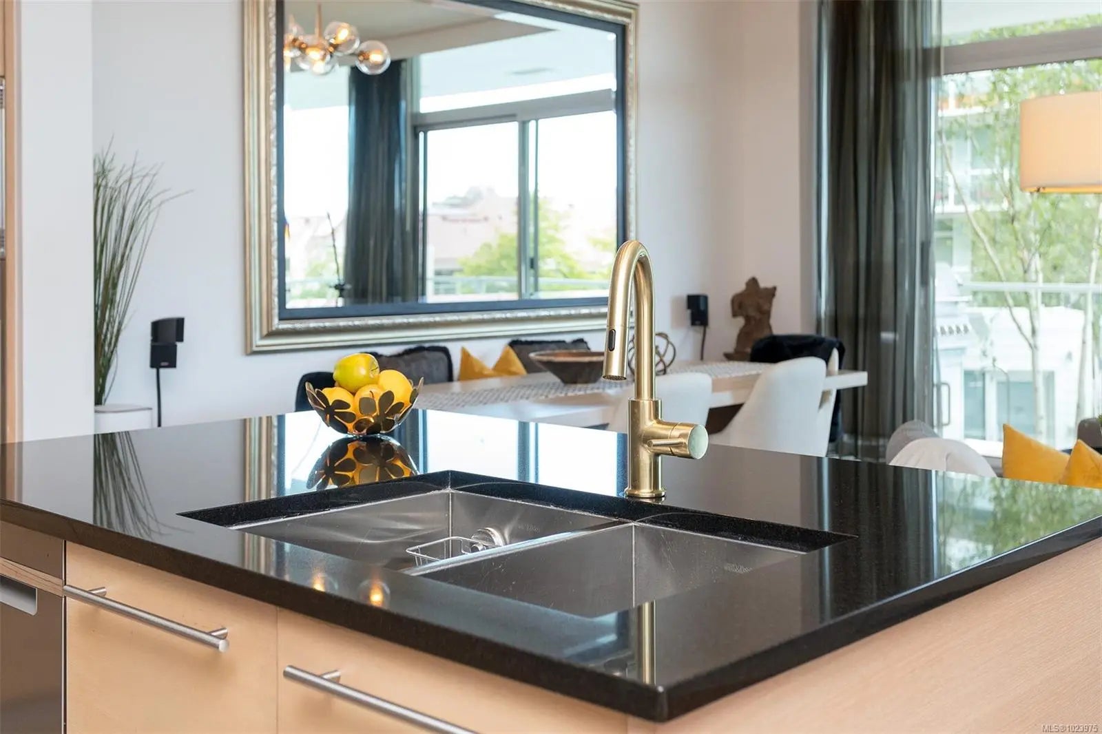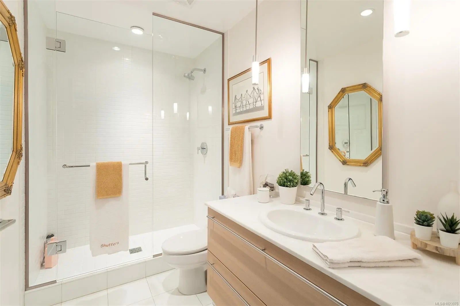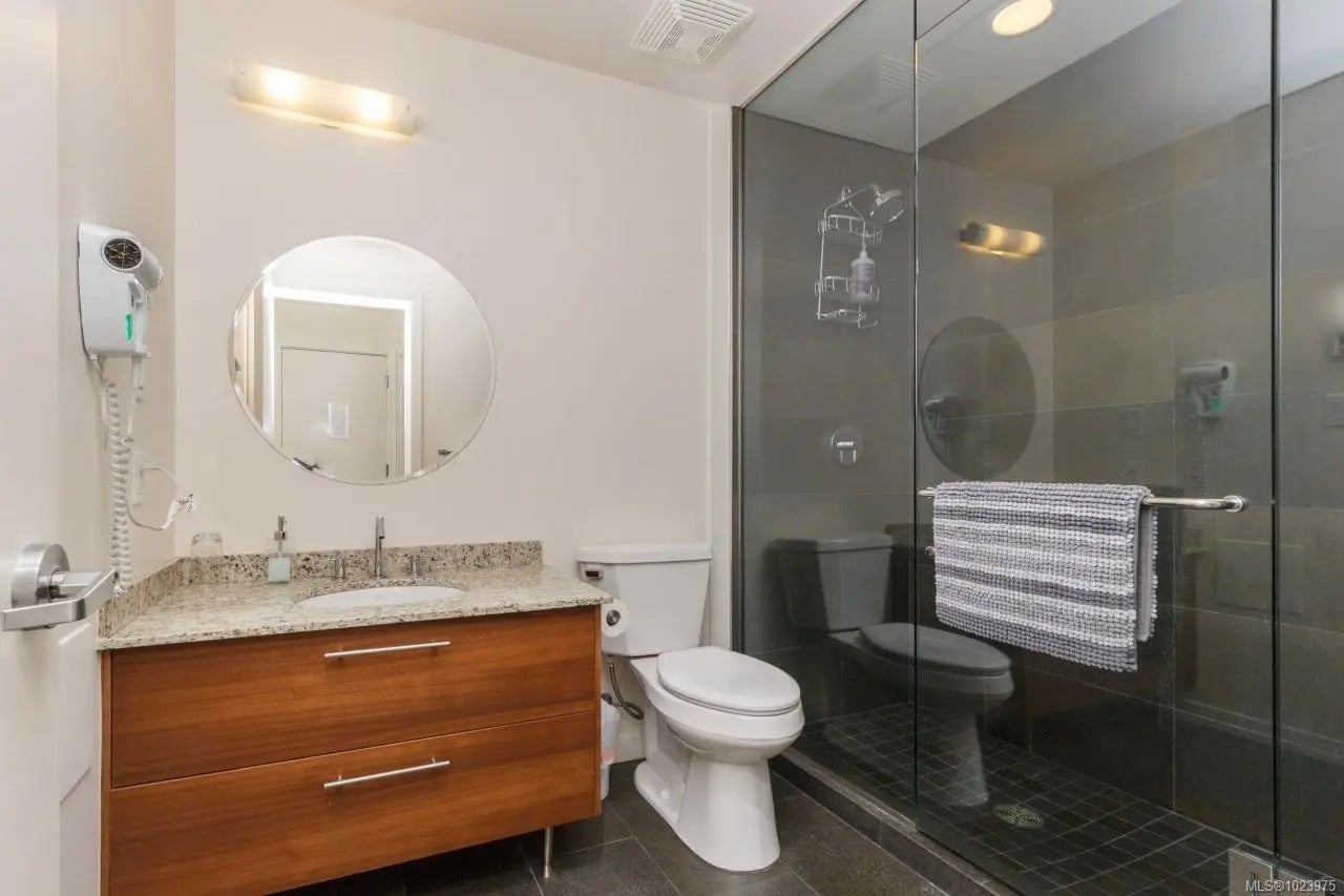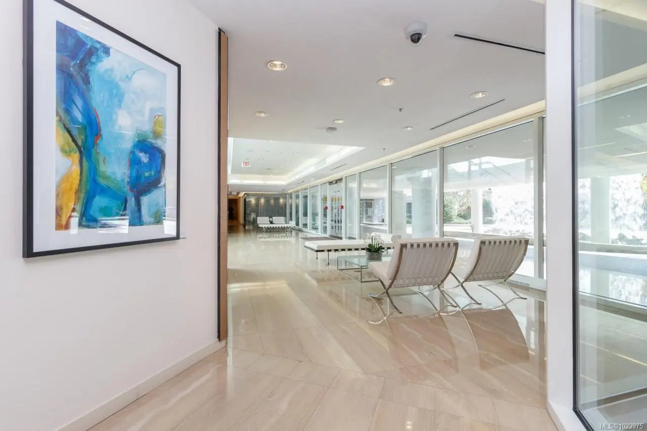 A SHOWPIECE in THE ICONIC SHUTTERS-customized,lightly lived in, this open concept suite is an anomaly in the development. Wonderful 2 bedrm+office, including custom double, rosewood,built-in wall cabinet/desk/"Murphy bed"(3rd bd), with 2 ensuite baths. Unique,very sought after floorplan & the "only" end unit of it's kind, offering views in 2 directions. Perched over the gurgling water features, fringed w/birch trees,providing quiet, privacy. Views from all main rooms, beyond the softly lit 75" infinity pool, the Parliament Blds illuminate the skyline, Cruise ships, Fishermans Wharf, & Harbour lites accent the balcony ambiance.1st owner, professionally designed, painted & upgraded. New appl-W/D, dishwasher, custom full granite designer kitchen w/ industrial style sink, brass tap,draperies,lighting, upgraded hardwood throughout.Seller purchased an add. high demand-2ND parking stall, now included, side/side, near crescent elevator.(LS re-details)Opportunity knocks...occasionally!
