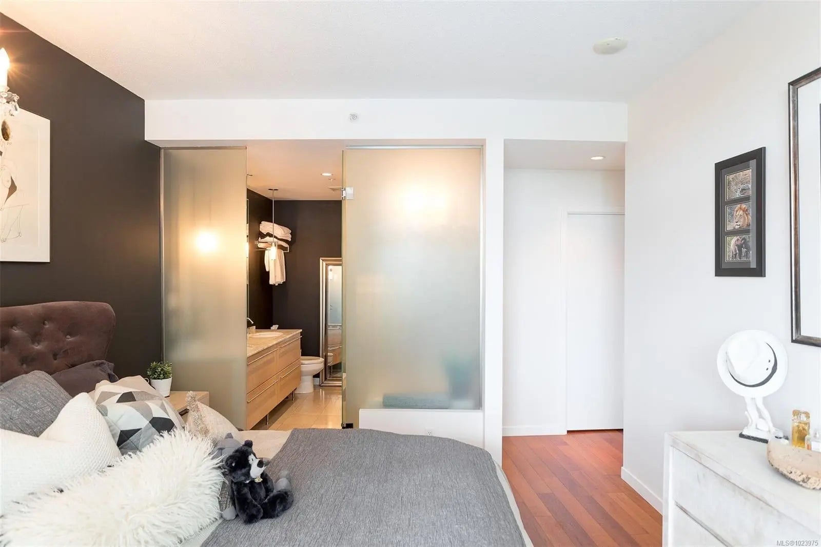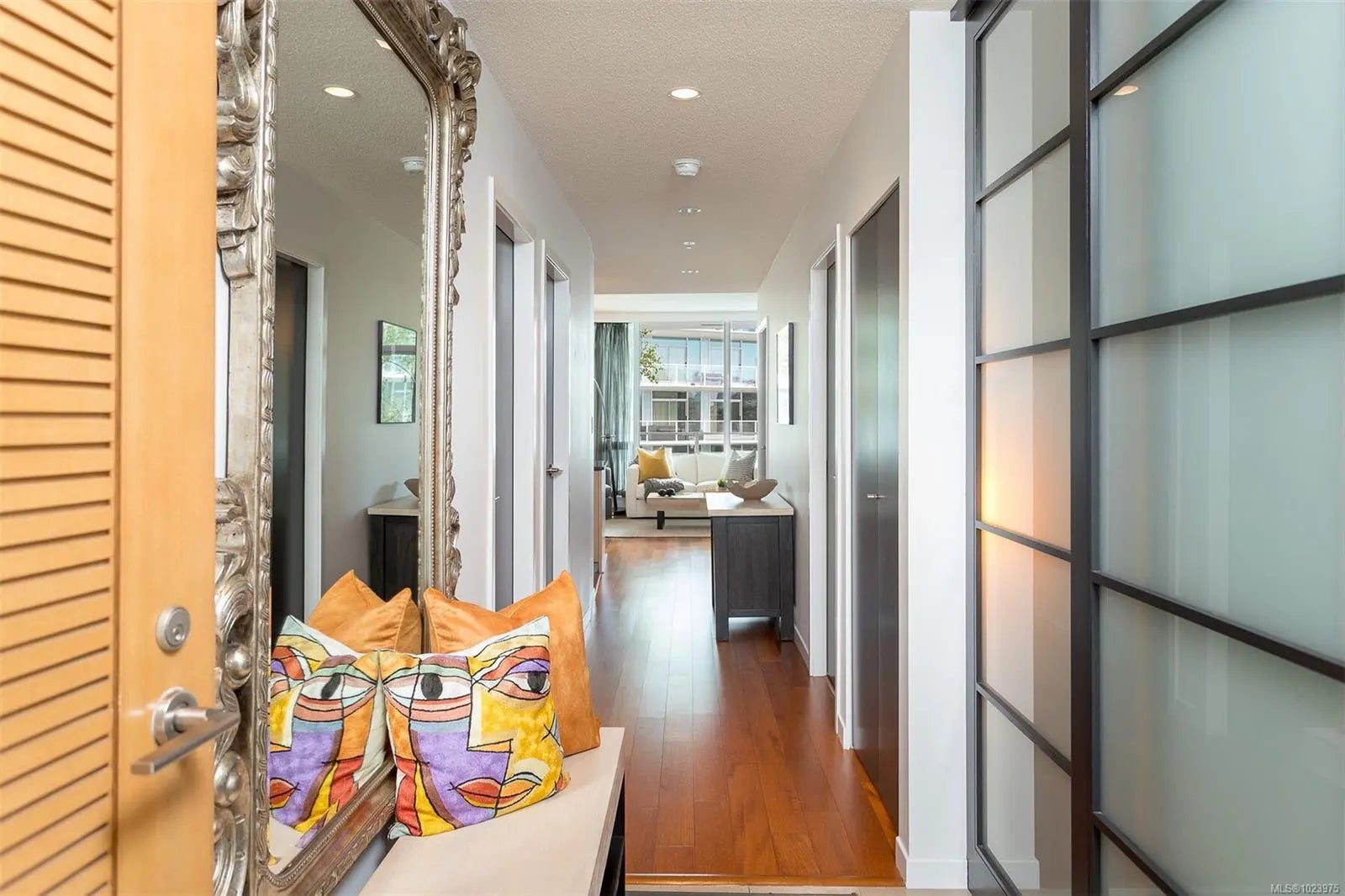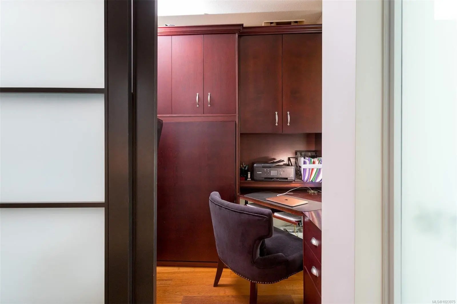 A SHOWPIECE in THE ICONIC SHUTTERS-customized,lightly lived in, this open concept suite is an anomaly in the development. Wonderful 2 bedrm+office, including custom double, rosewood,built-in wall cabinet/desk/"Murphy bed"(3rd bd), with 2 ensuite baths. Unique,very sought after floorplan & the "only" end unit of it's kind, offering views in 2 directions. Perched over the gurgling water features, fringed w/birch trees,providing quiet, privacy. Views from all main rooms, beyond the softly lit 75" infinity pool, the Parliament Blds illuminate the skyline, Cruise ships, Fishermans Wharf, & Harbour lites accent the balcony ambiance.1st owner, professionally designed, painted & upgraded. New appl-W/D, dishwasher, custom full granite designer kitchen w/ industrial style sink, brass tap,draperies,lighting, upgraded hardwood throughout.Seller purchased an add. high demand-2ND parking stall, now included, side/side, near crescent elevator.(LS re-details)Opportunity knocks...occasionally!