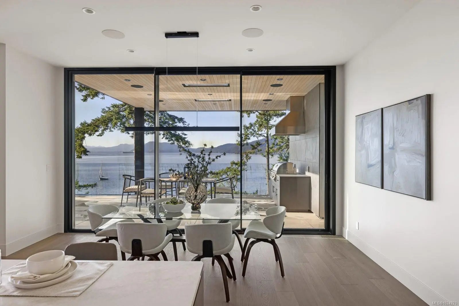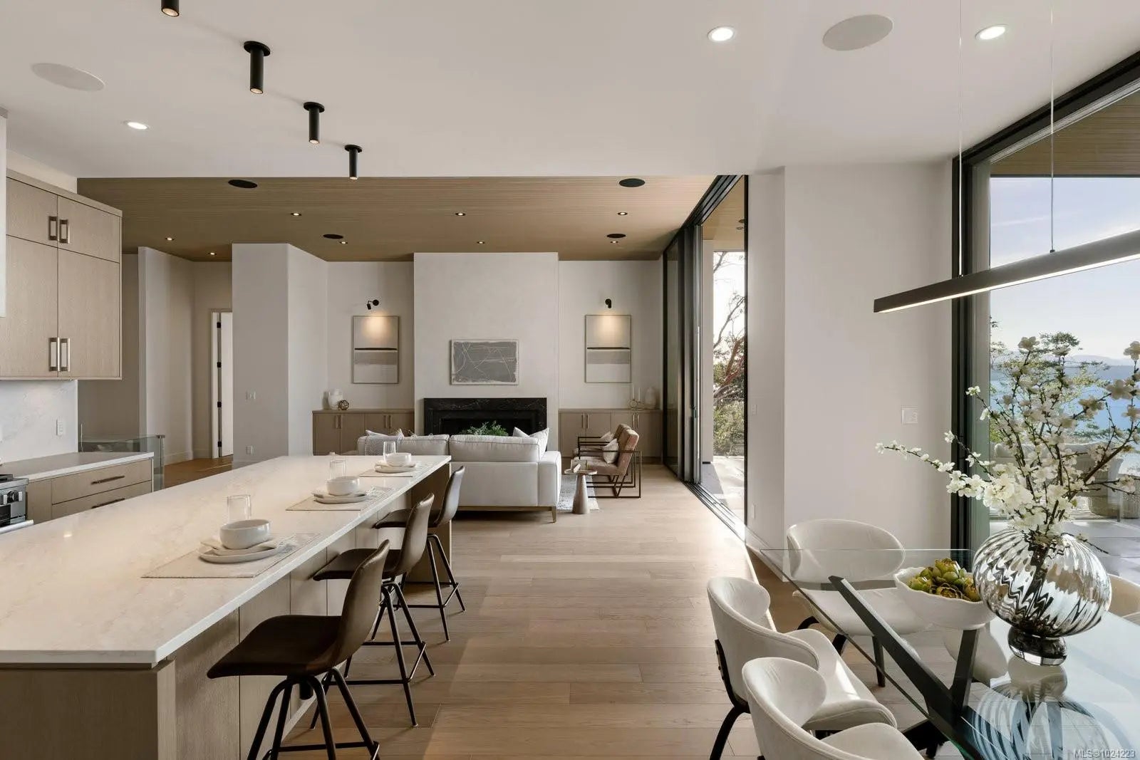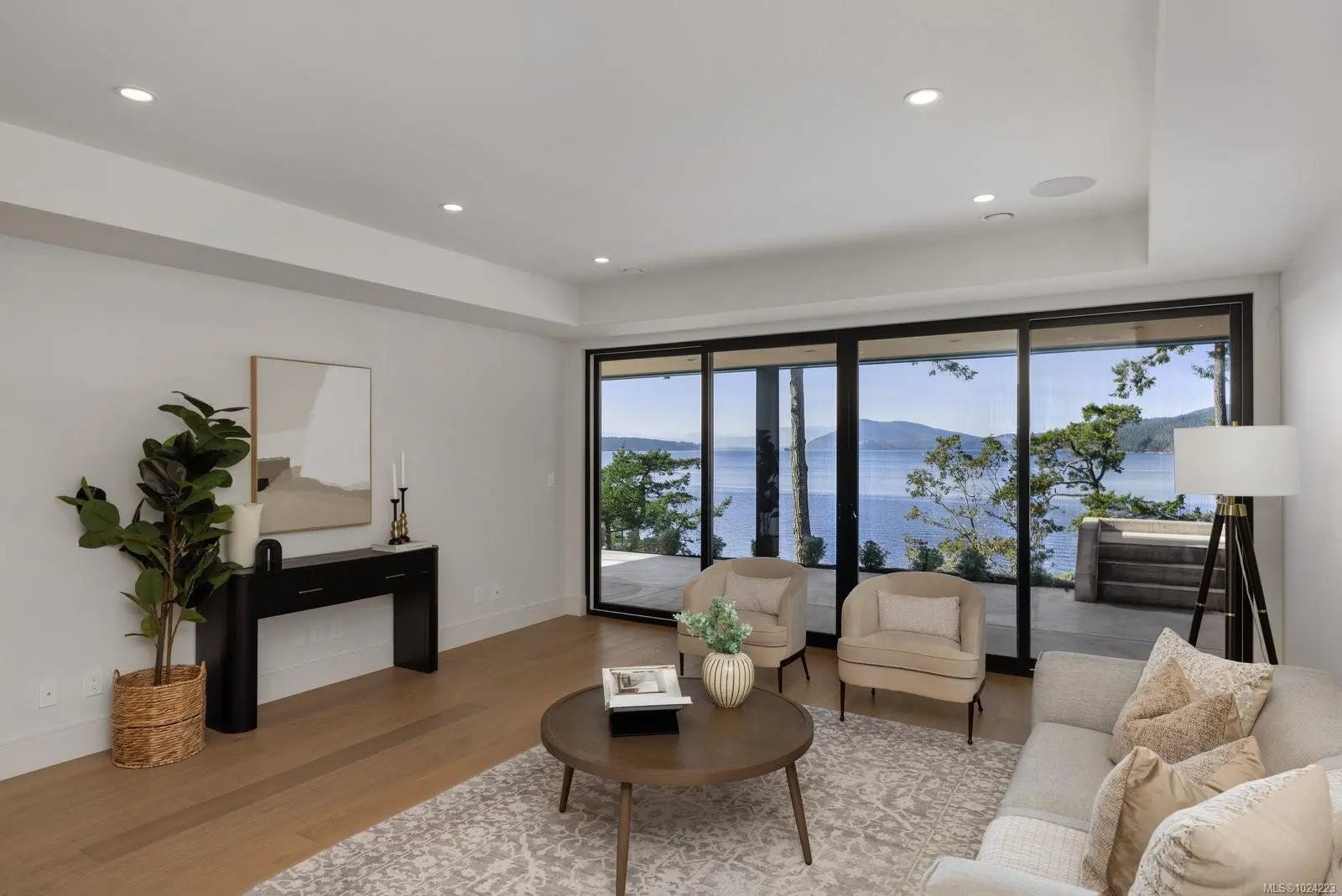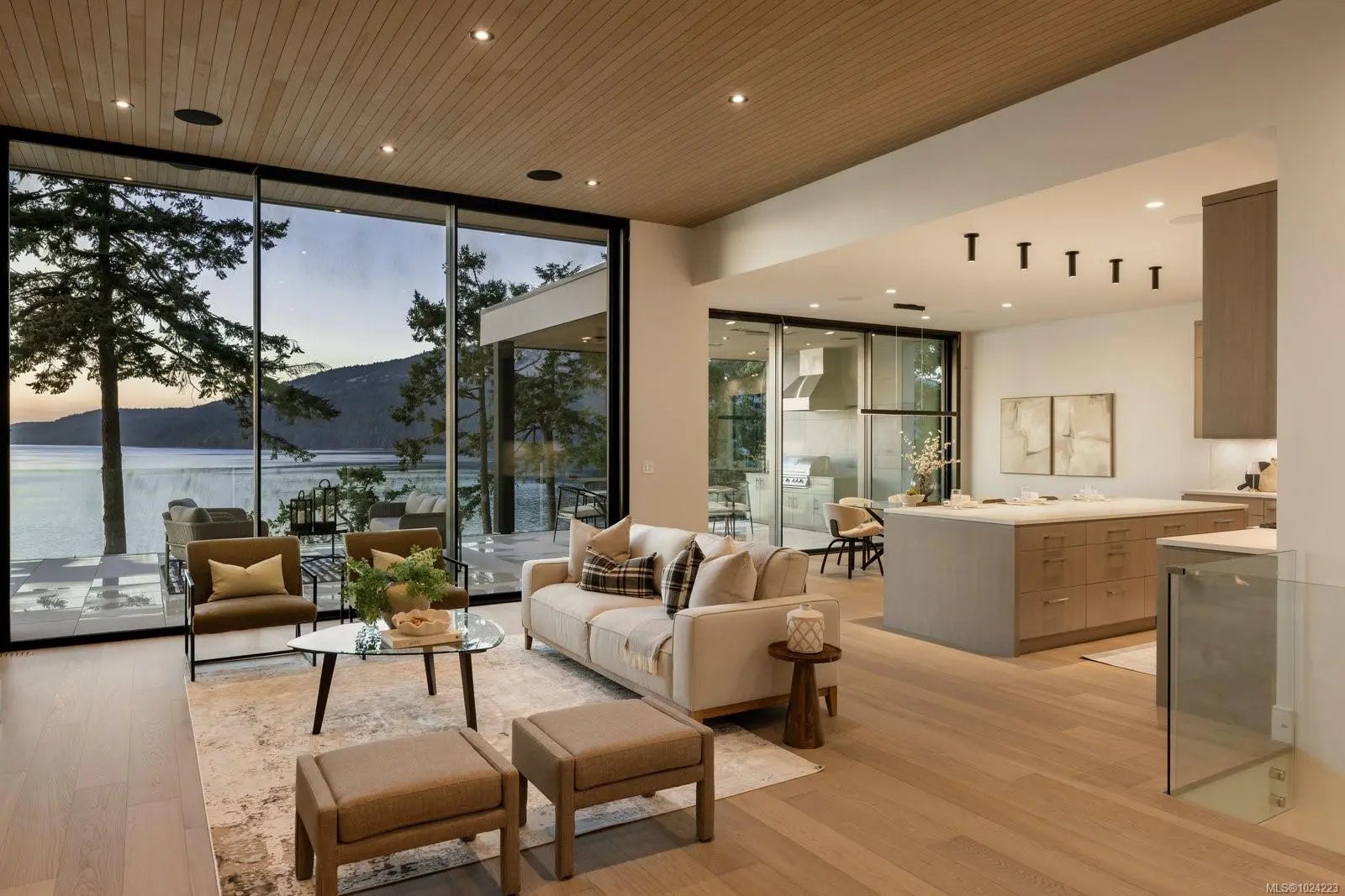 Experience resort-level comfort in complete privacy at this striking oceanfront retreat. Set on 1.08 acres with coveted western exposure, the 3,908 sq ft residence captures unforgettable sunsets and sweeping water views from nearly every room. Architecturally designed to maximize natural light, the home pairs modern lines with warm, natural materials—wood ceilings, soft textures, and impeccable finishes that feel calm and inviting. The open main living area features soaring 10–12’ ceilings, expansive windows, and dramatic floor-to-ceiling sliding doors that blur the line between indoors and out. Entertain effortlessly in the chef’s kitchen with a premium Miele appliance package, then dine al fresco on the heated covered terrace. A gated driveway, 3-car garage, and ample parking add convenience, while the thoughtful “lock-and-leave” design makes ownership easy. Built by award-winning contractor GT Mann, this is West Coast living at its finest.