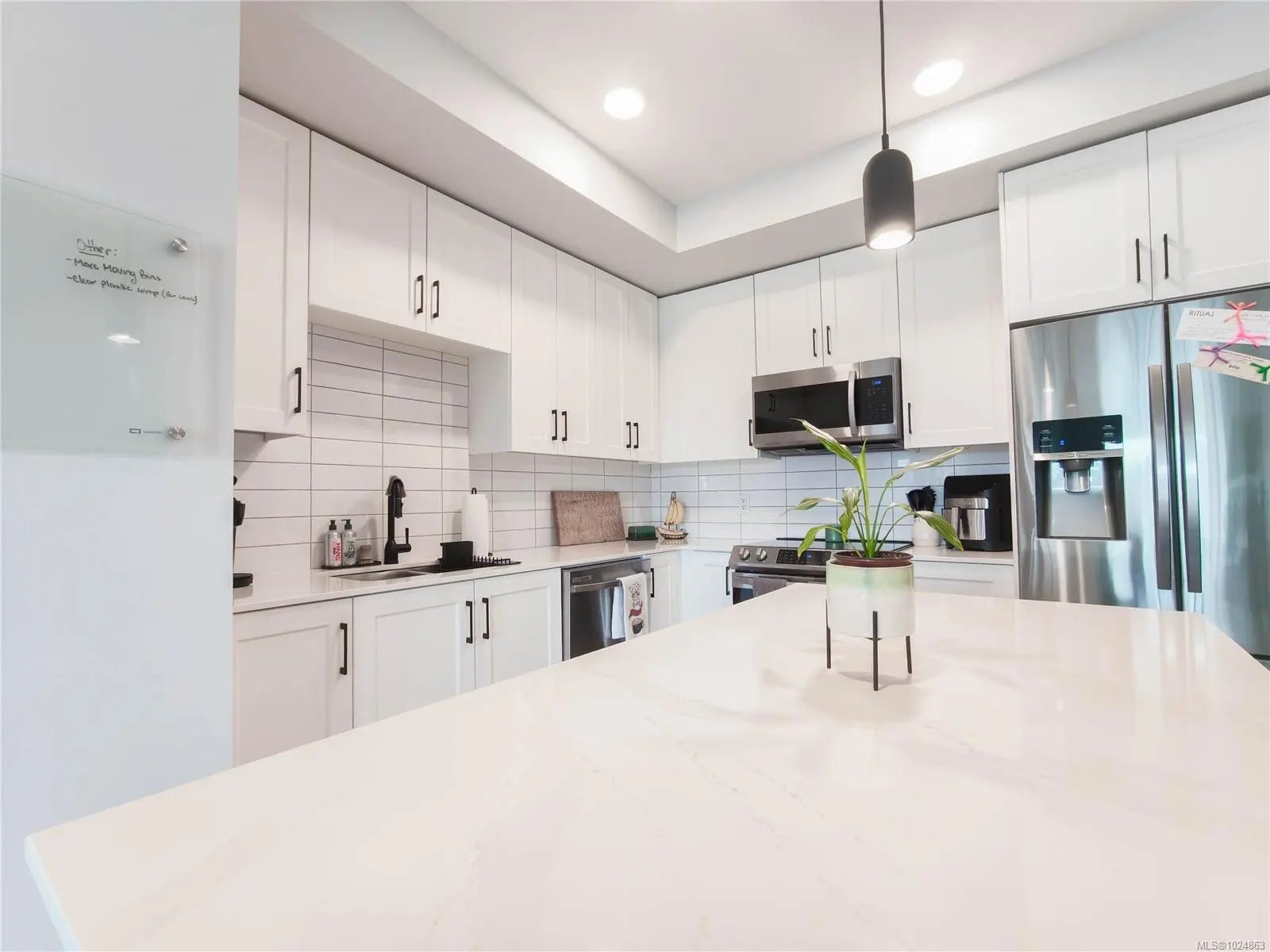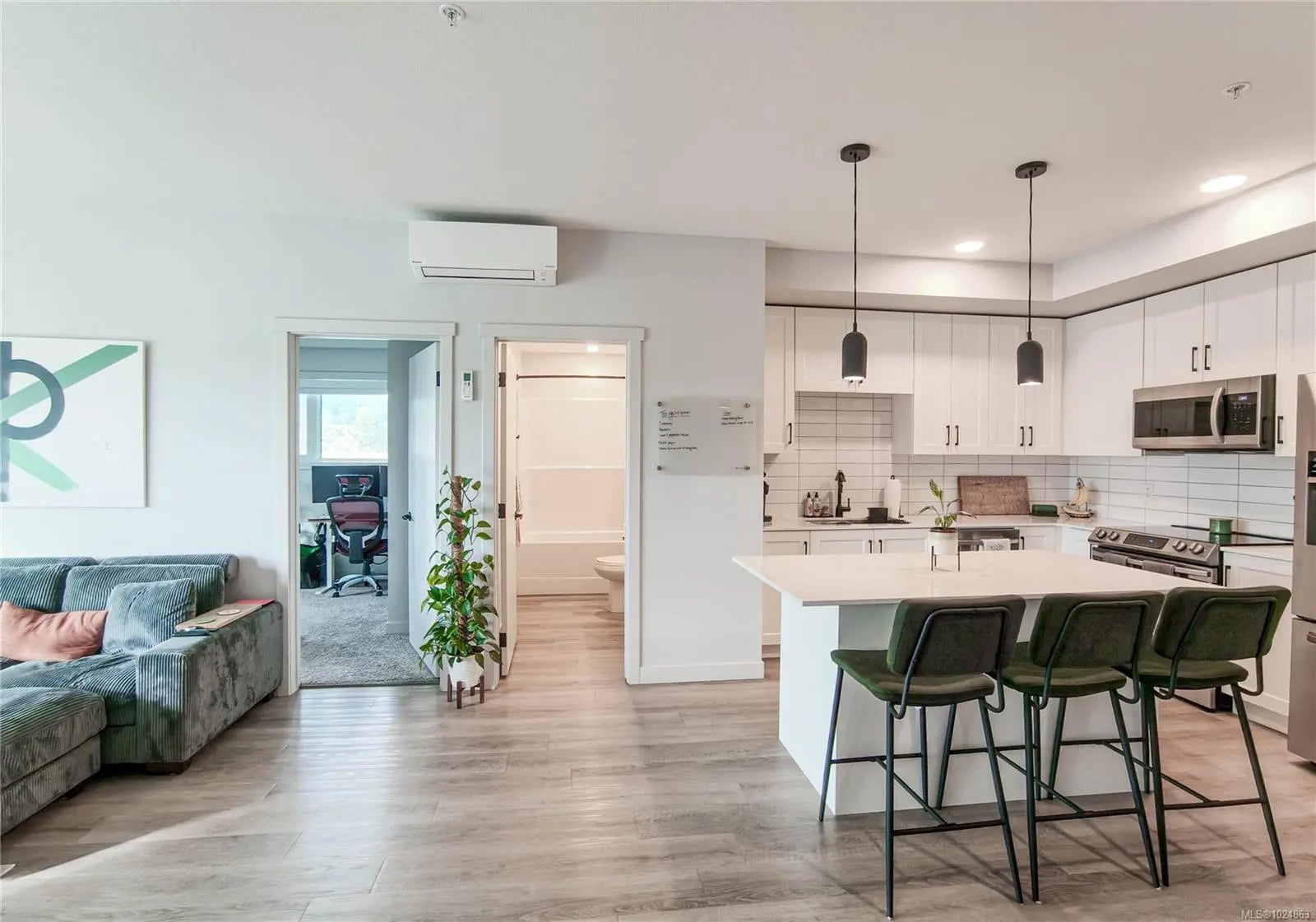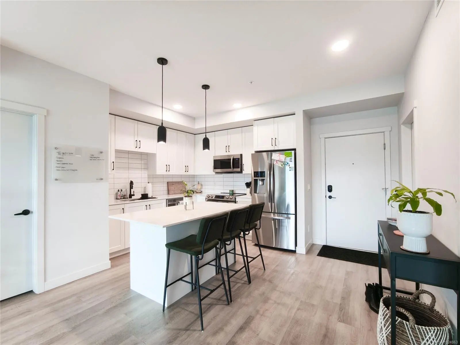 Beautiful CORNER residence with a huge wrap-around deck and TWO parking stalls, offering exceptional space, light, and flexibility. This bright 2-bed, 2-bath home features a sleek open-concept kitchen with large quartz countertops, soft-close cabinetry, stainless steel appliances, a heat pump, and an advanced flood-detection system. Enjoy beautiful views from the living area and balcony, perfect for relaxing or entertaining. Built to the province’s highest energy-efficiency standards, the building boasts LED lighting and triple-pane windows for year-round comfort. Two parking stalls add rare convenience for both homeowners and investors. Building amenities include a rooftop deck, fitness centre, dog run, community gardens, EV charging stations, resident lounge, bike storage, and more. Ideally located near shops, dining, and everyday essentials, this is modern condo living at its best.