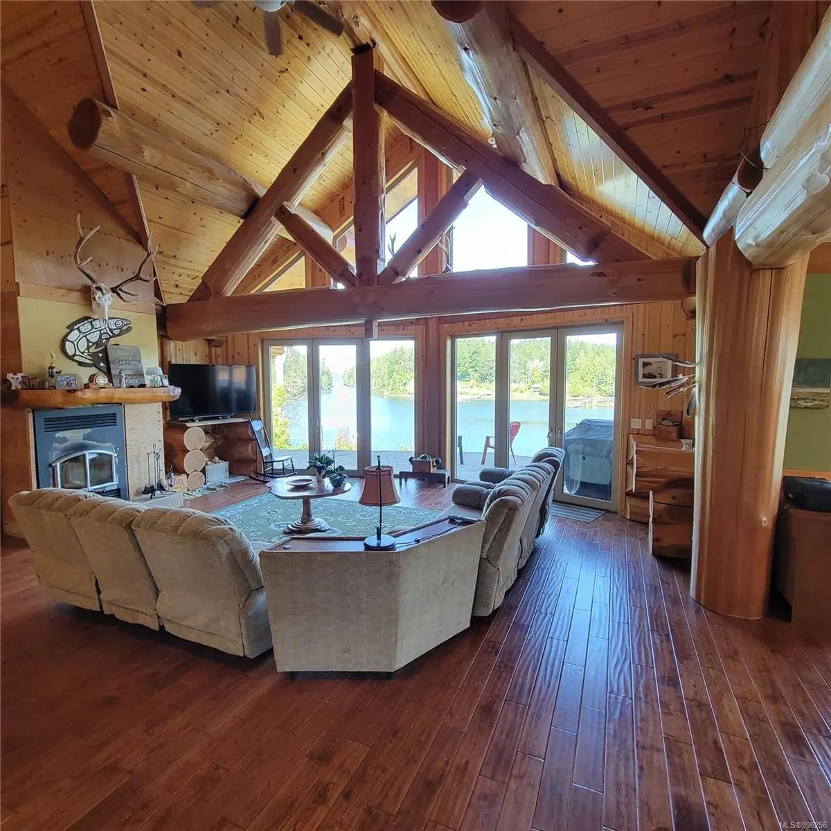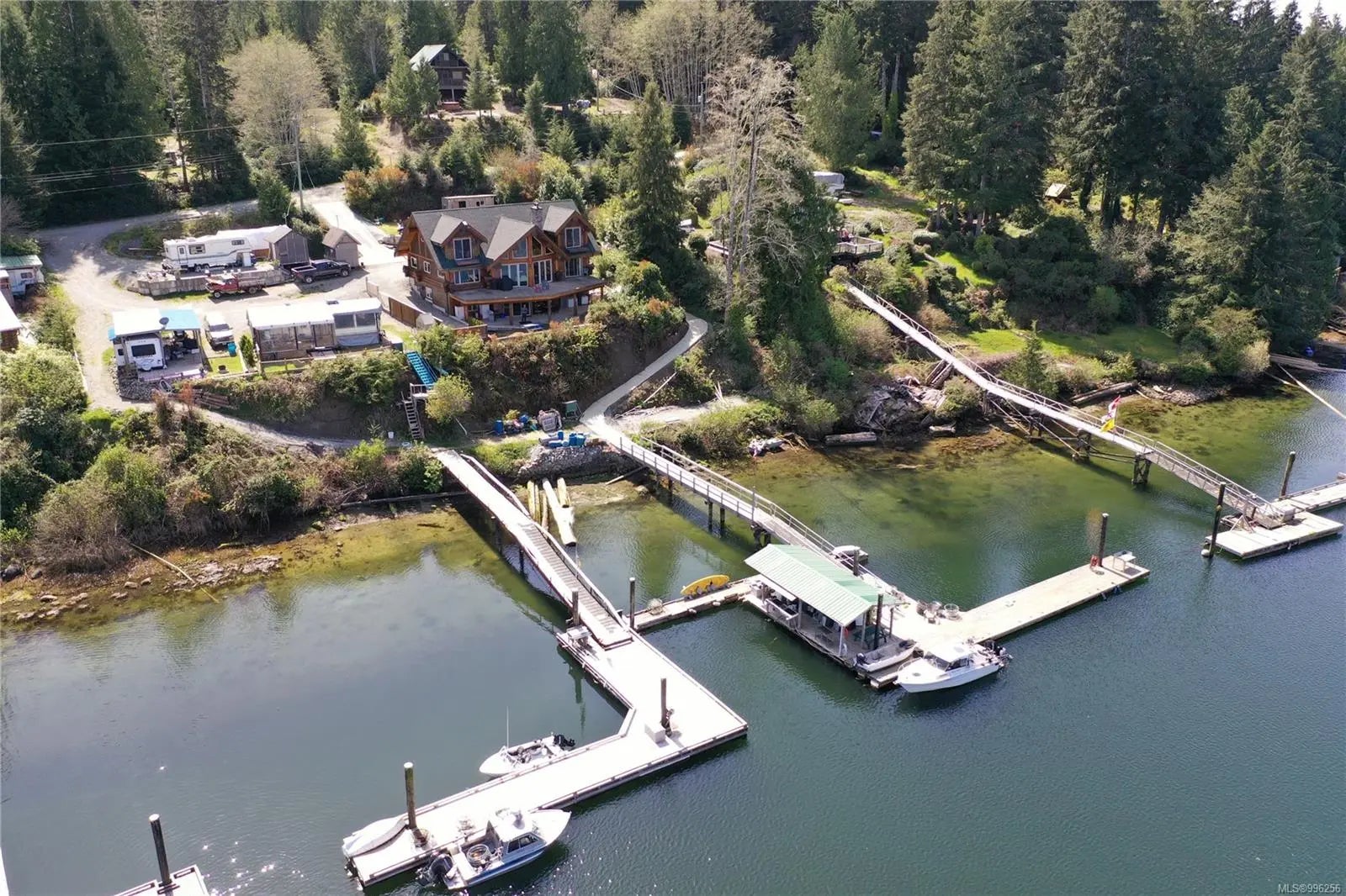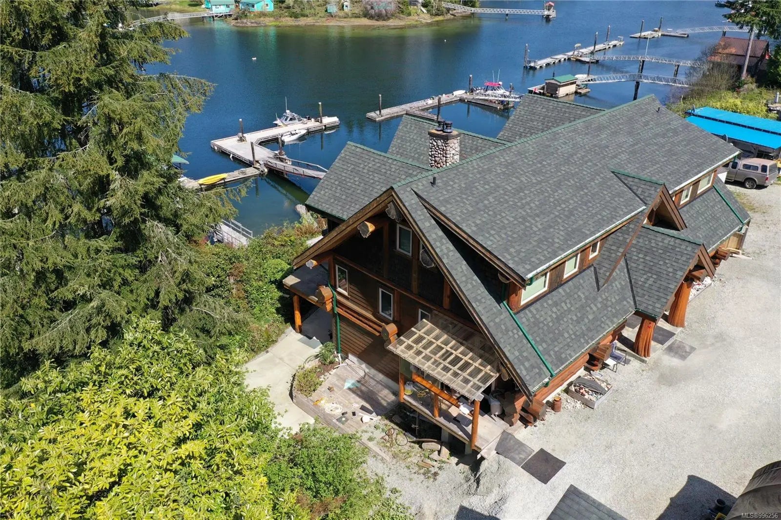 Escape to your own spectacular waterfront retreat nestled in the serene beauty of Bamfield’s Grappler Inlet. This magnificent 4,200 sq/ft log home sits on a 1/3-acre lot, offering protected moorage and instant access to world-class ocean adventures, paired with the peaceful charm of coastal living. Crafted to blend natural elegance with modern comfort, this one-of-a-kind home features an open-concept design with grand vaulted ceilings, soaring full-height windows to maximize views, and a spacious layout offering 5 bedrooms and 6 bathrooms. A large concrete deck off the main level overlooks the inlet, perfect for entertaining or simply soaking in the tranquil surroundings. The upper level boasts an expansive games room and a luxurious master suite. The lower-level houses a fully self-contained 3-bedroom, 3-bathroom suite with a walk-out patio, currently being utilized as guest accommodation for a thriving Fishing Charter business. A pathway leads down to the 85-foot dock.